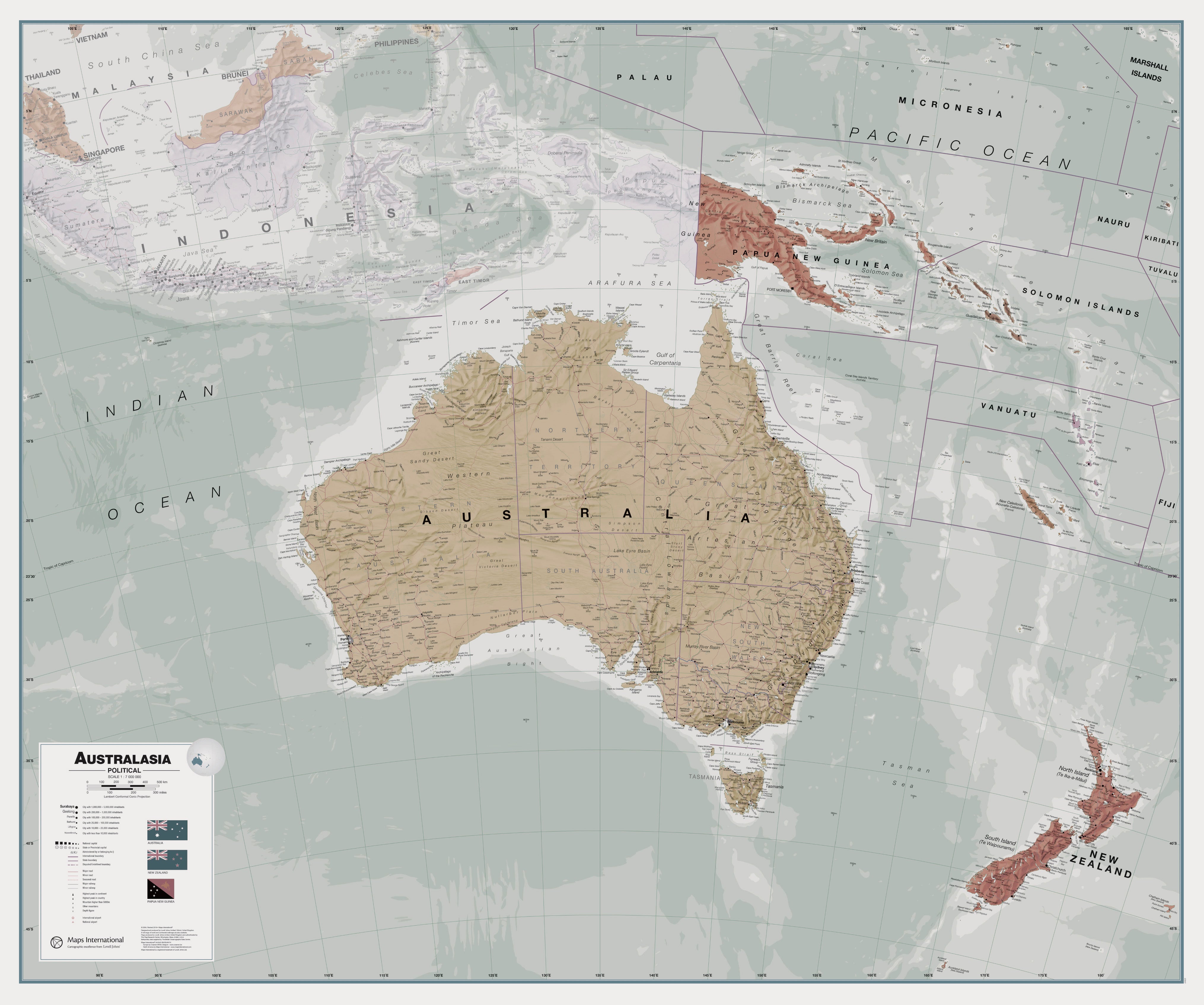 Spanning the diverse lands of Australia, New Zealand, Papua New Guinea, and the islands of the broader Australasian region, each country is coloured in a complementary muted tone, while clearly defined international boundaries help delineate regions with elegance and clarity. This is not just a map—it’s a conversation piece, a design statement, and a functional geographic tool, all in one.