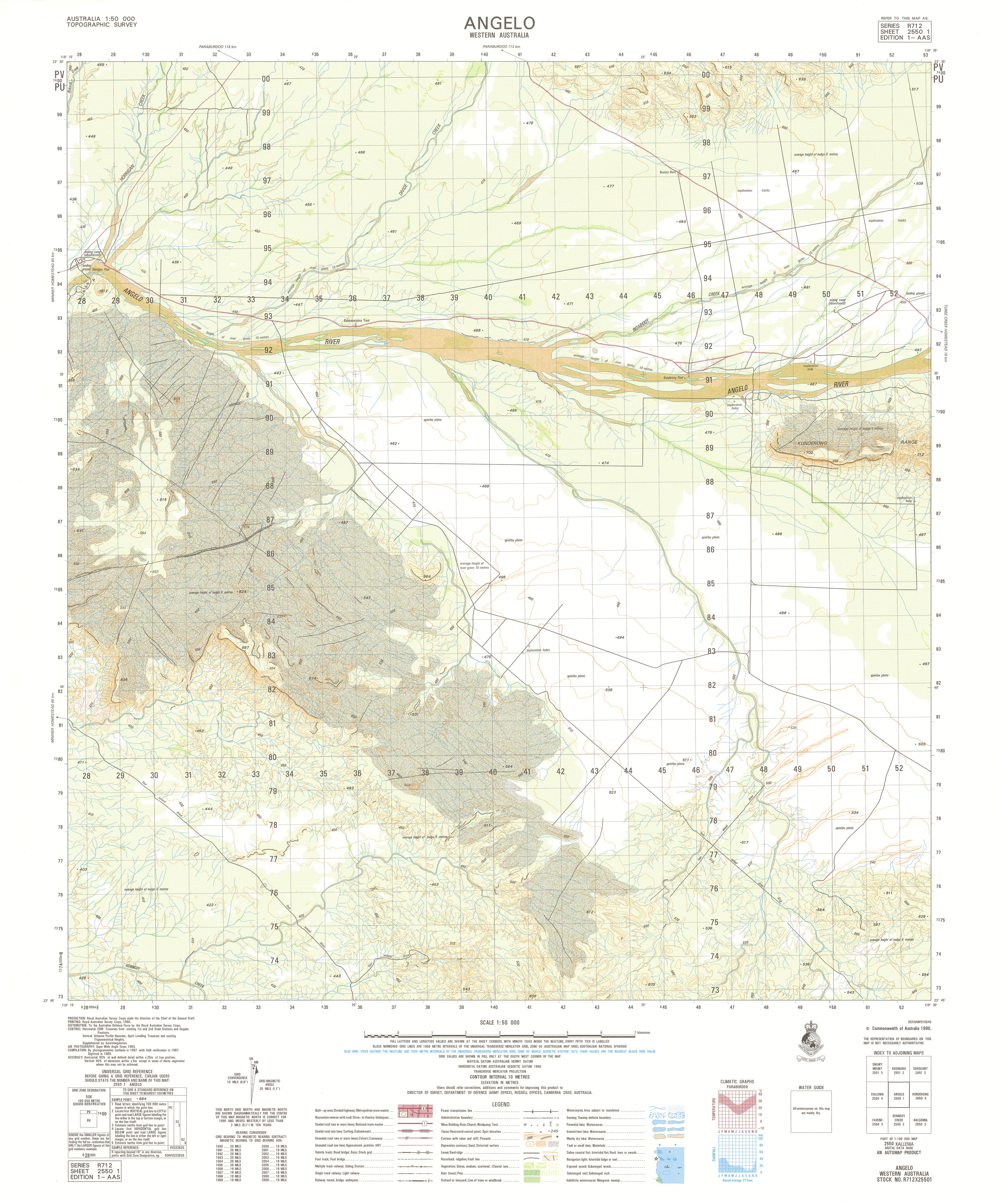 At 1:50,000 scale — 1 cm = 500 m, the Angelo sheet includes: