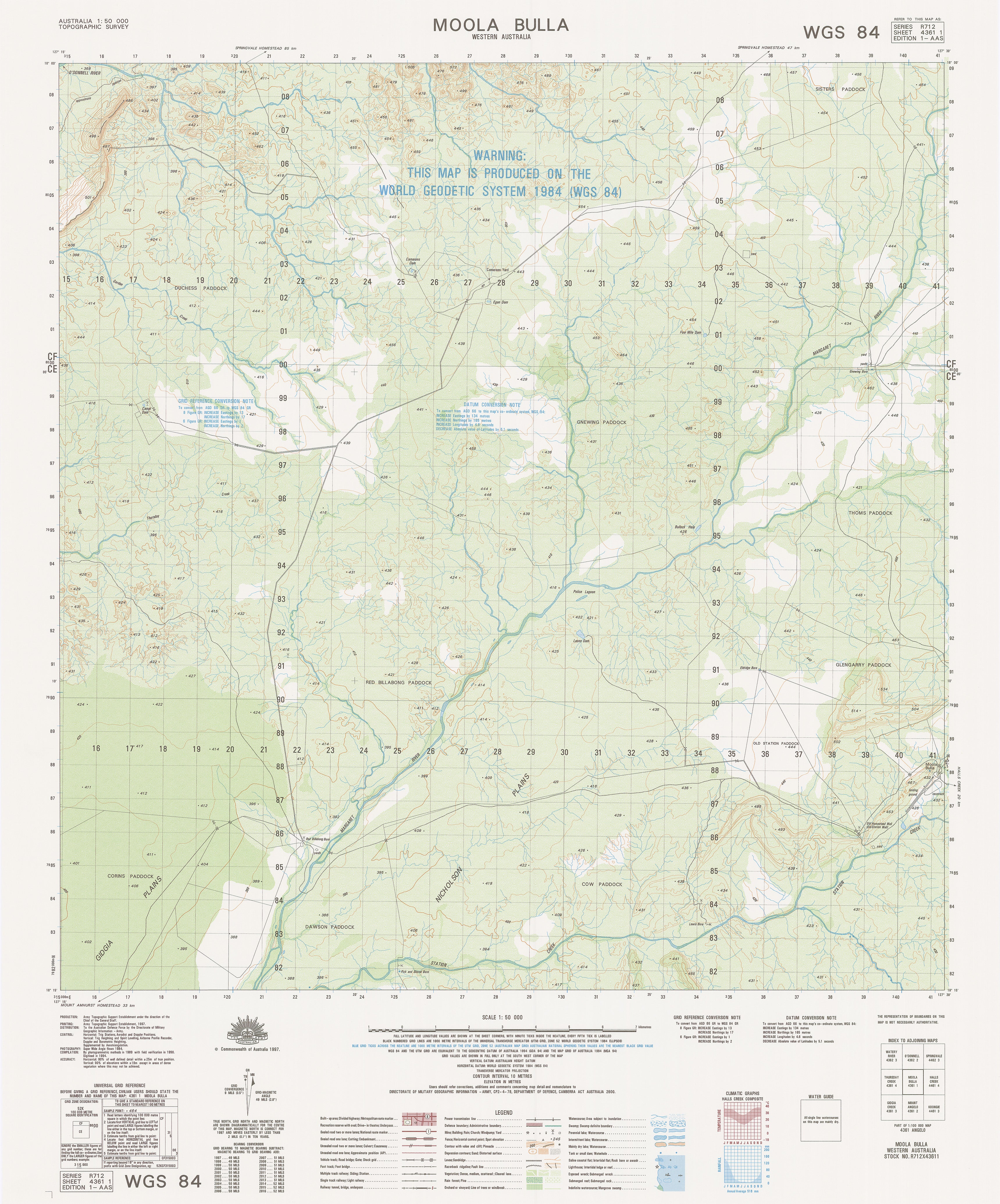 At 1:50,000 scale — 1 cm = 500 m, the Moola Bulla sheet includes: