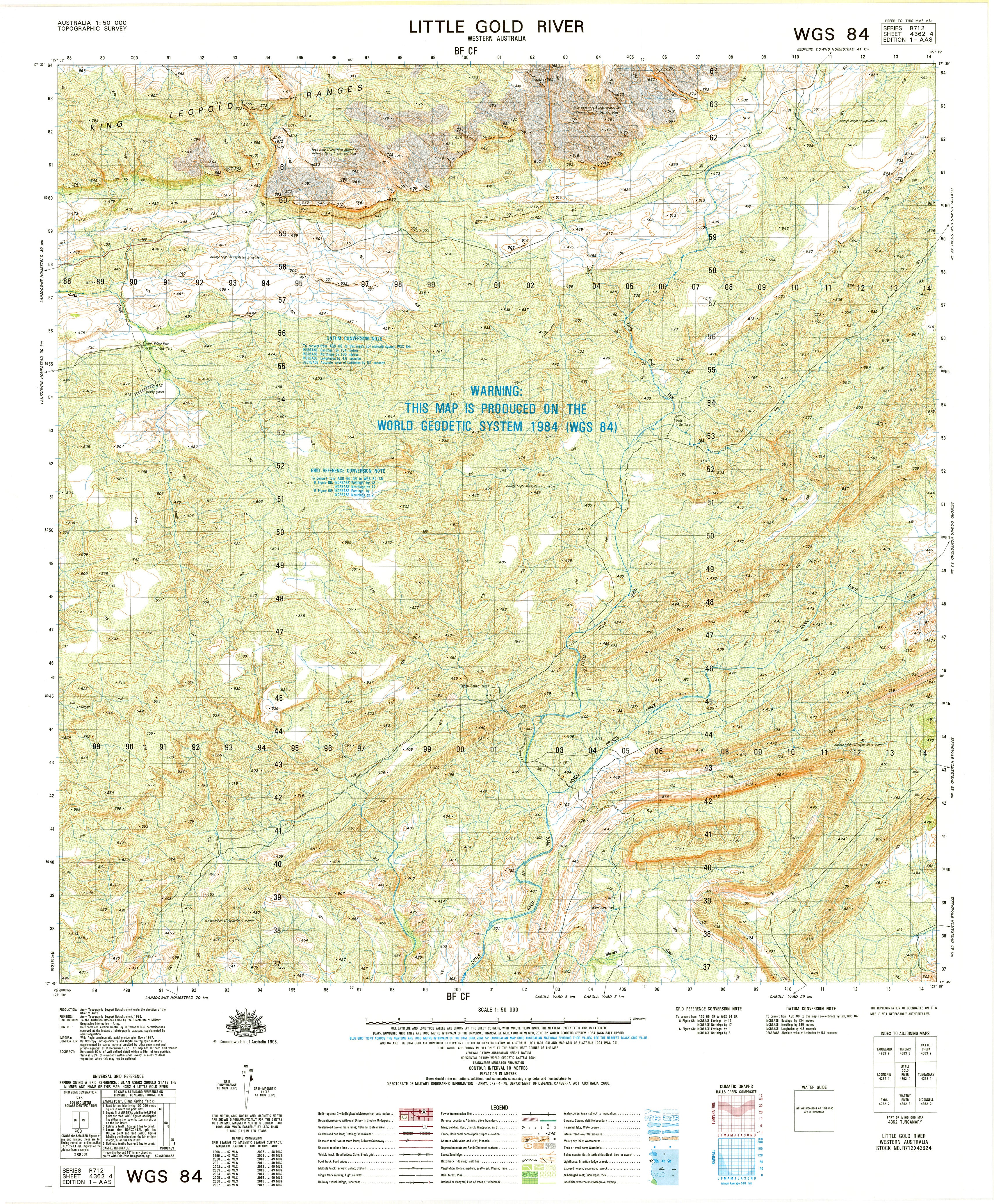 The 4362-4 Little Gold River 1:50,000 topographic sheet provides precise, authoritative mapping across a remote inland region shaped by river channels, seasonal floodplains, low rises, stony plains and expansive pastoral landscapes. Produced under Australia’s national 1:50k mapping program, this sheet delivers the high-quality geographic detail essential for emergency services, environmental consultants, surveyors, engineers, land managers and remote-area navigators.