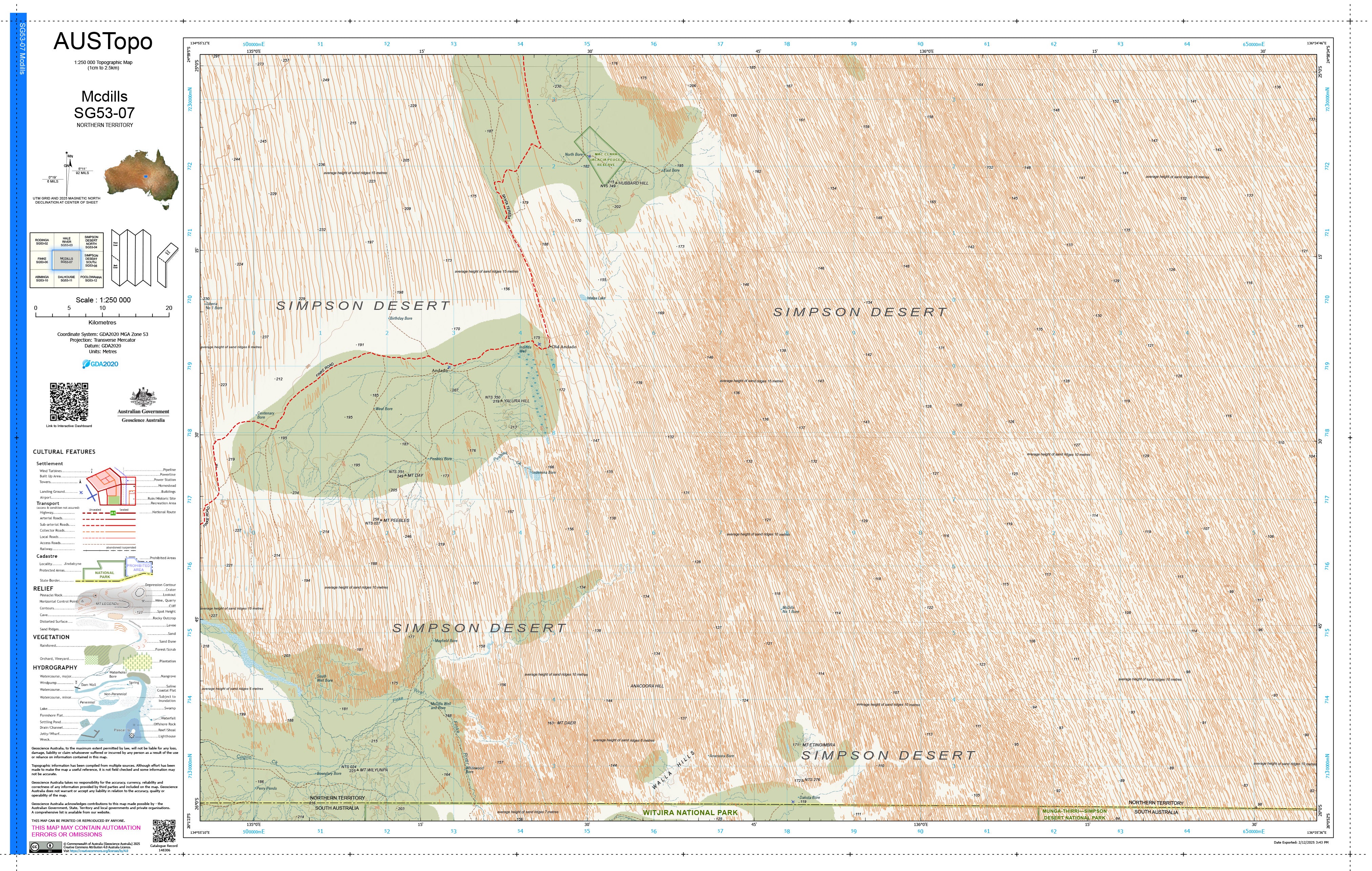At 1:250,000 scale (1 cm = 2.5 km), it is the largest scale at which published topographic maps cover the entire Australian continent—ideal for expedition planning, land management, emergency coordination, and serious outback navigation.