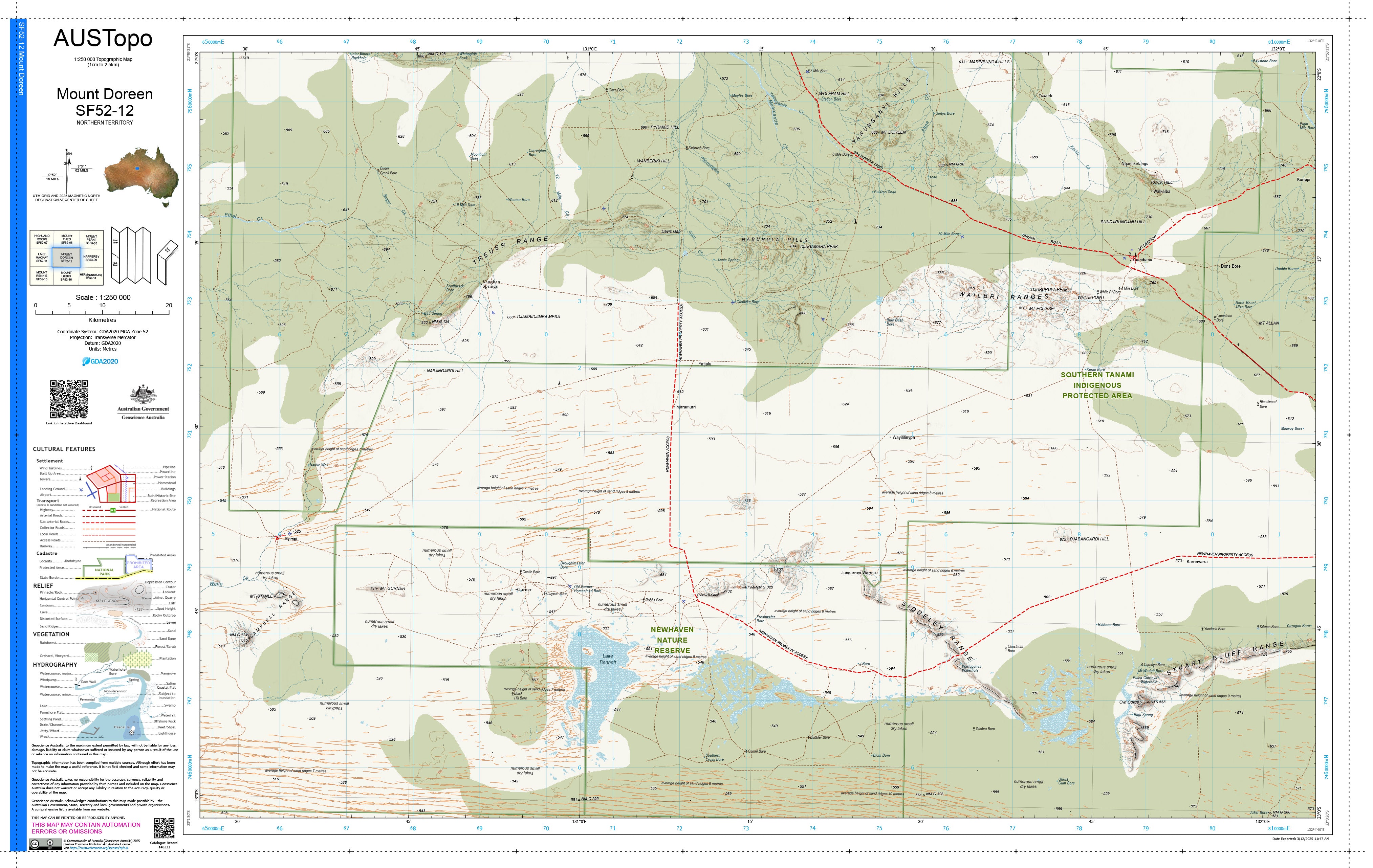 Covering Mount Doreen and the surrounding Central Australian interior, this AUSTopo 1:250,000 sheet delivers a clear, authoritative regional overview of classic outback country where pastoral leases meet arid plains and desert margins. From station infrastructure and airstrips to drainage systems, sandplains, and long-distance access tracks, it provides dependable big-picture context for planning, operations, and serious outback navigation.