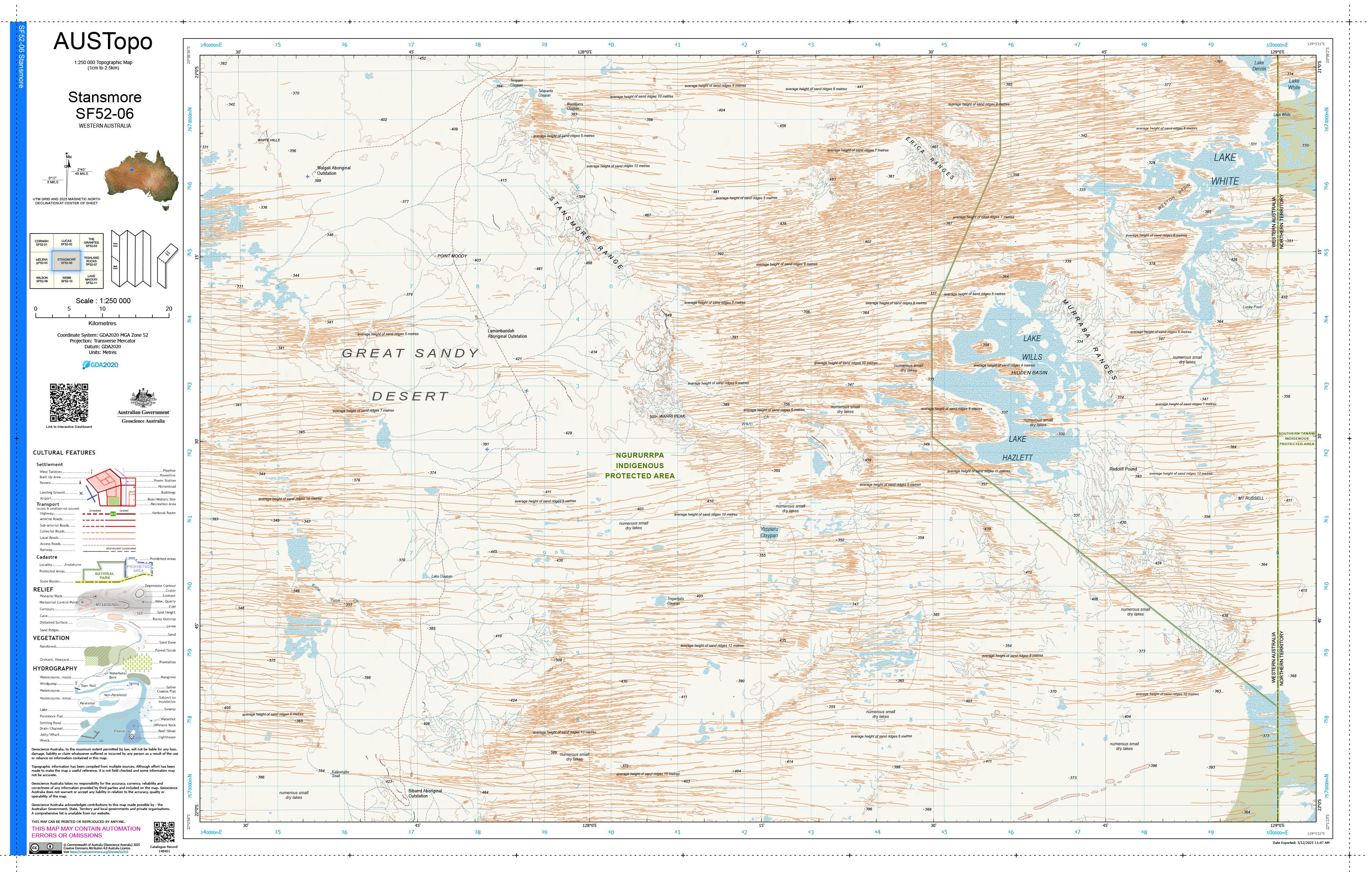Covering Stansmore and the surrounding Western Desert of Central Australia, this AUSTopo 1:250,000 sheet delivers a clear, authoritative regional overview of arid country shaped by broad sandplains, claypans, and ancient drainage lines. From subtle uplands and dry creek systems to isolated airstrips and station infrastructure, it provides essential big-picture context for exploration, land management, and serious outback operations.