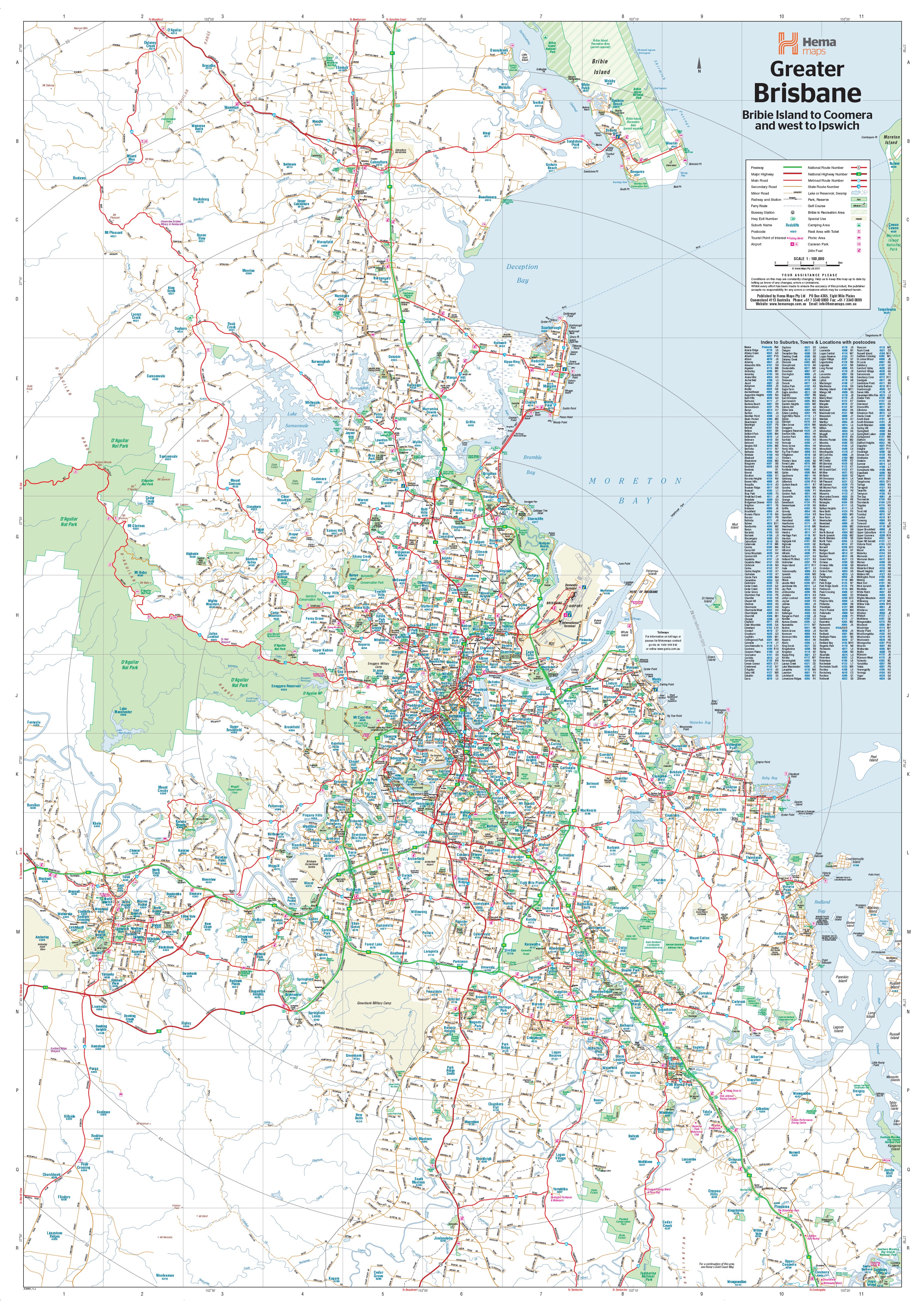 The Greater Brisbane Supermap by Hema delivers wall-filling clarity from Bribie Island (north) to Jimboomba (south) and west to Ipswich. At a detailed 1:70,000 scale, it shows major and secondary roads, Metroad routes, national & state route numbers, and present and planned freeways—plus postcodes and a suburb index for fast lookups. Perfect for planning, logistics, teaching, or a standout office display.