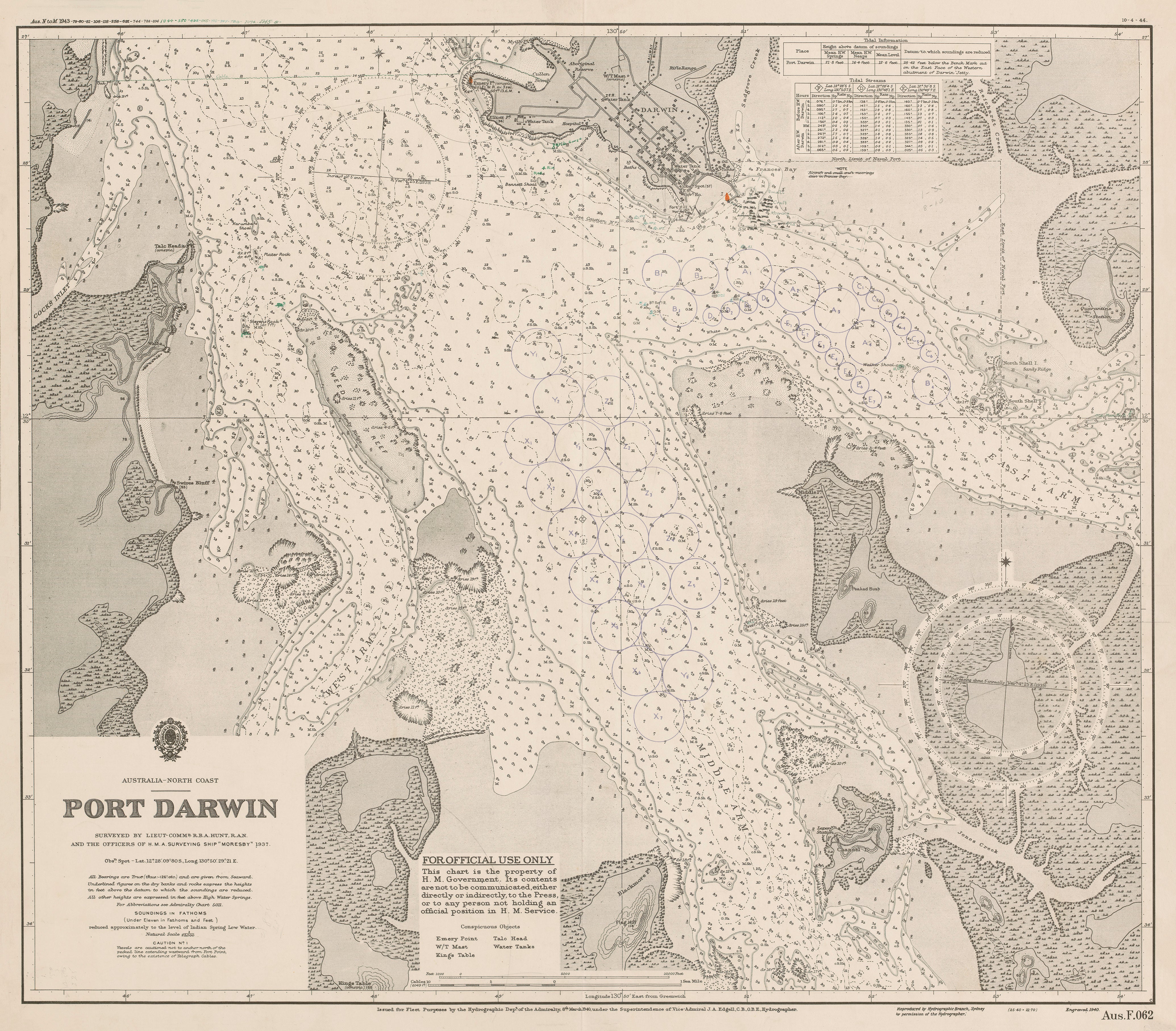 This finely executed hydrographic chart of Port Darwin captures the harbour as surveyed in 1937 by Lieutenant-Commander R. B. A. Hunt, R.A.N., and the officers of H.M.A. surveying ship H.M.A.S. Moresby. Reproduced in 1944 by the Hydrographic Branch Sydney—by permission of the Hydrographer—this edition reflects wartime revisions and operational updates crucial to Darwin’s defence and logistics during World War II.