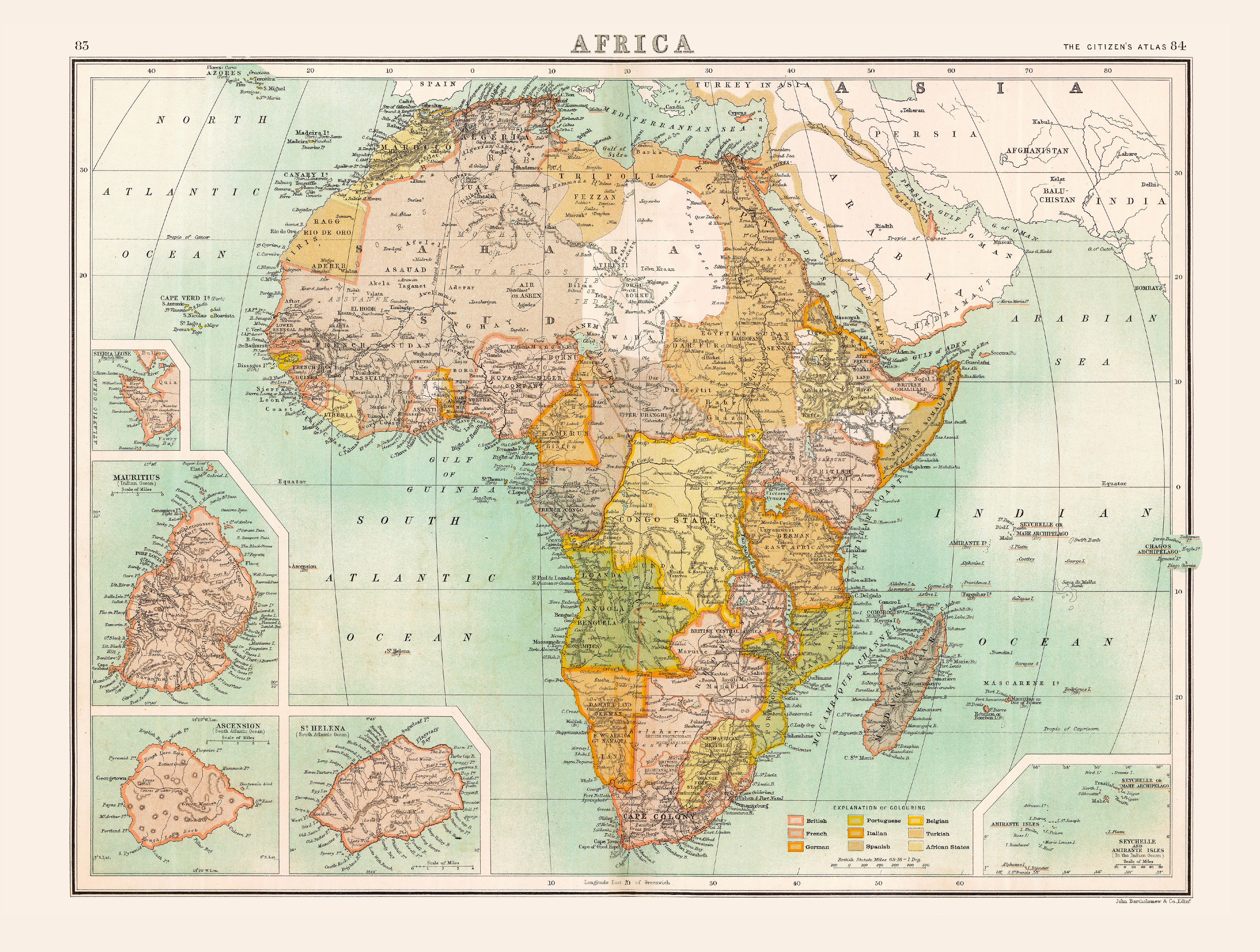 A snapshot of a continent at the height of the colonial era, rendered with clarity and restraint. Taken from The Citizen’s Atlas and published in 1898 (maps by John Bartholomew & Co. Ltd. for Collins), this sheet brings Africa into sharp focus. Colonial jurisdictions are clarified in a dedicated legend, while international boundaries, principal towns, transport links, and coastlines are set out in clean, legible cartography. Insets detail the islands of Sierra Leone, Mauritius, Ascension, St Helena, and the Seychelles & Amirante Isles—a richly informative piece that rewards both room-distance viewing and close study.