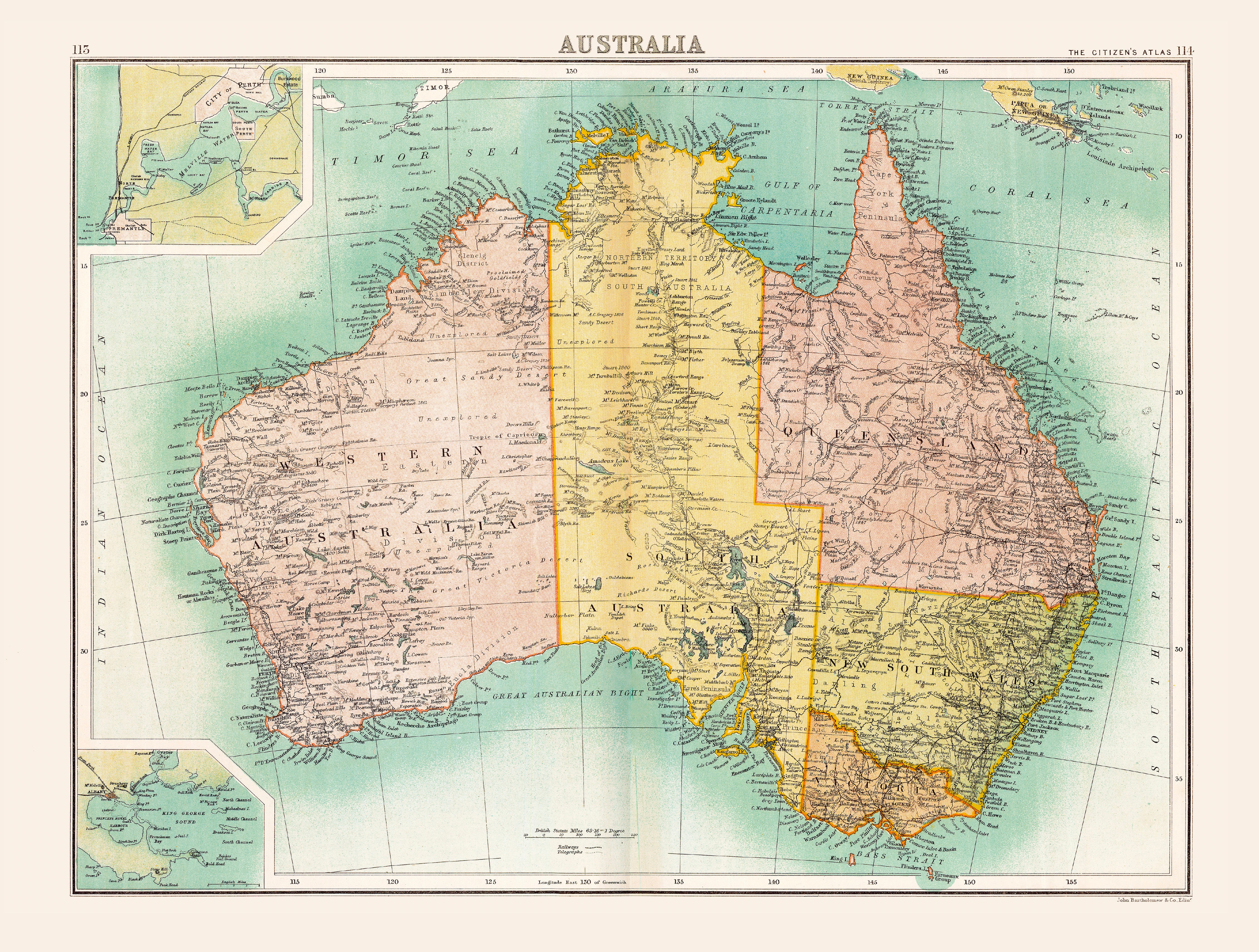See a continent poised for nationhood. First published in 1898 for The Citizen’s Atlas—engraved by John Bartholomew & Co. for Collins—this full-colour wall map records Australia’s geopolitical makeup just before Federation (1901). Colonial boundaries, capitals and key routes are shown with crisp Victorian clarity, while inset maps of the City of Perth and King George Sound add finely observed local detail. It’s a vivid, enduring snapshot of how Australia was understood at the close of the nineteenth century.