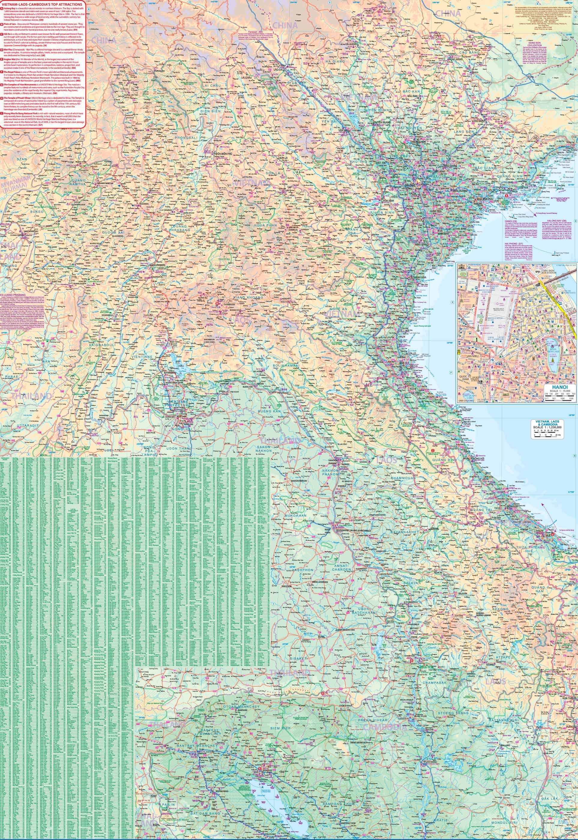 Side 2: Northern Indochina, extending from Siem Reap and Angkor Wat up to the northern reaches of Vietnam and Laos, with an inset of Hanoi.