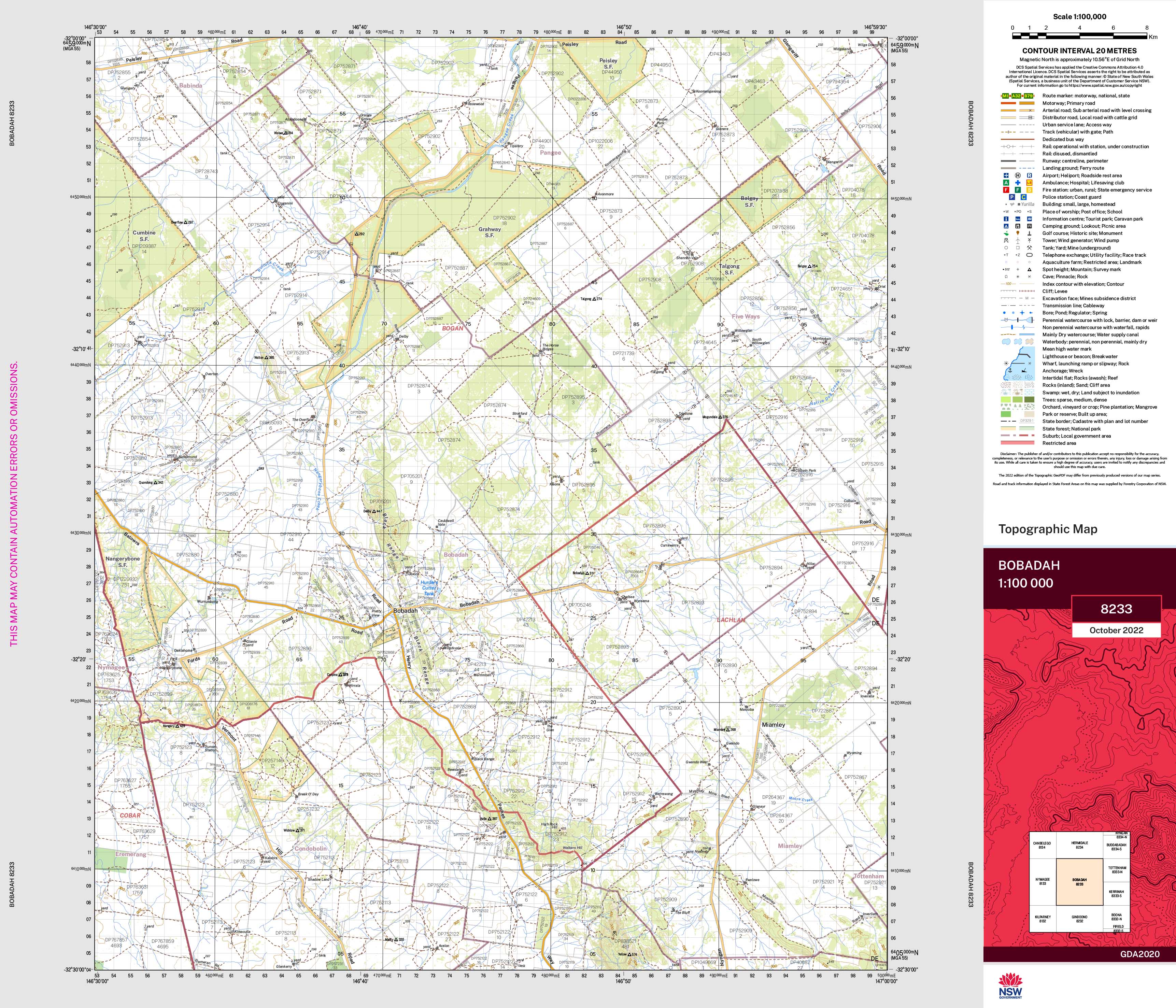 The Bobadah 1:100,000 scale New South Wales topographic map shows contours, streams, roads, tracks, buildings, place names, points of interest, vegetation, selected administrative boundaries and much more.