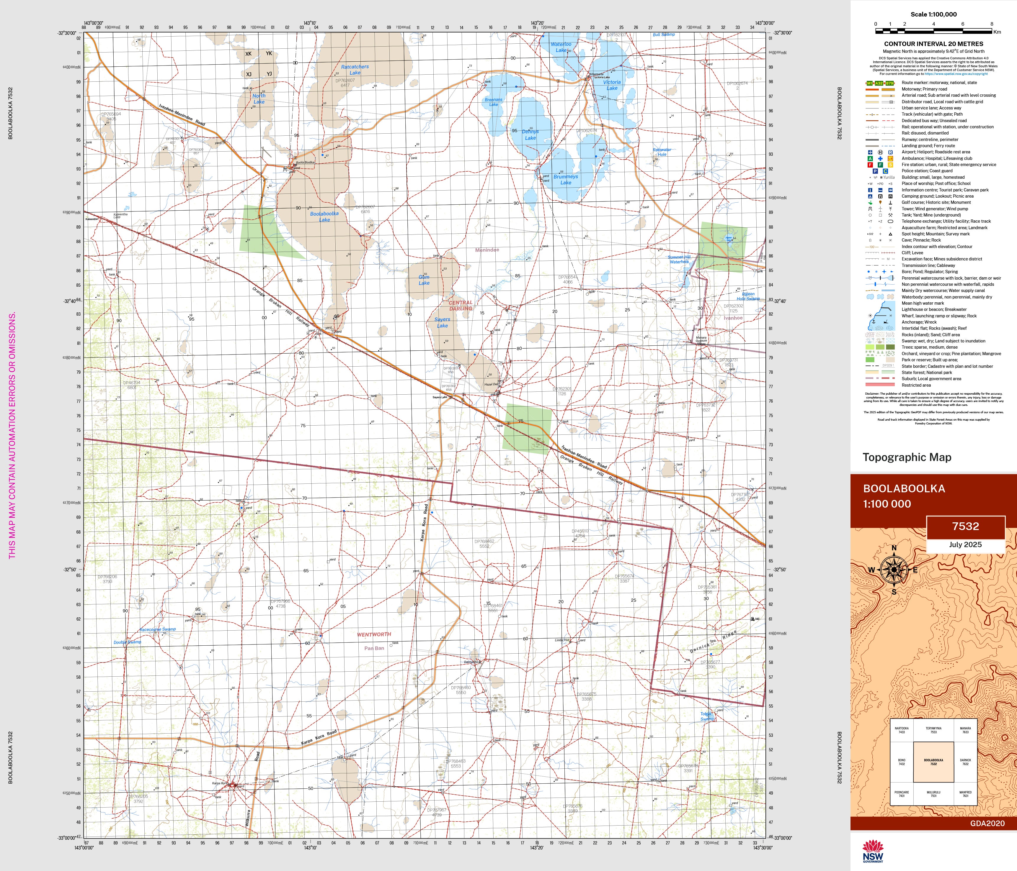 The Boolaboolka 1:100,000 scale New South Wales topographic map shows contours, streams, roads, tracks, buildings, place names, points of interest, vegetation, selected administrative boundaries and much more.