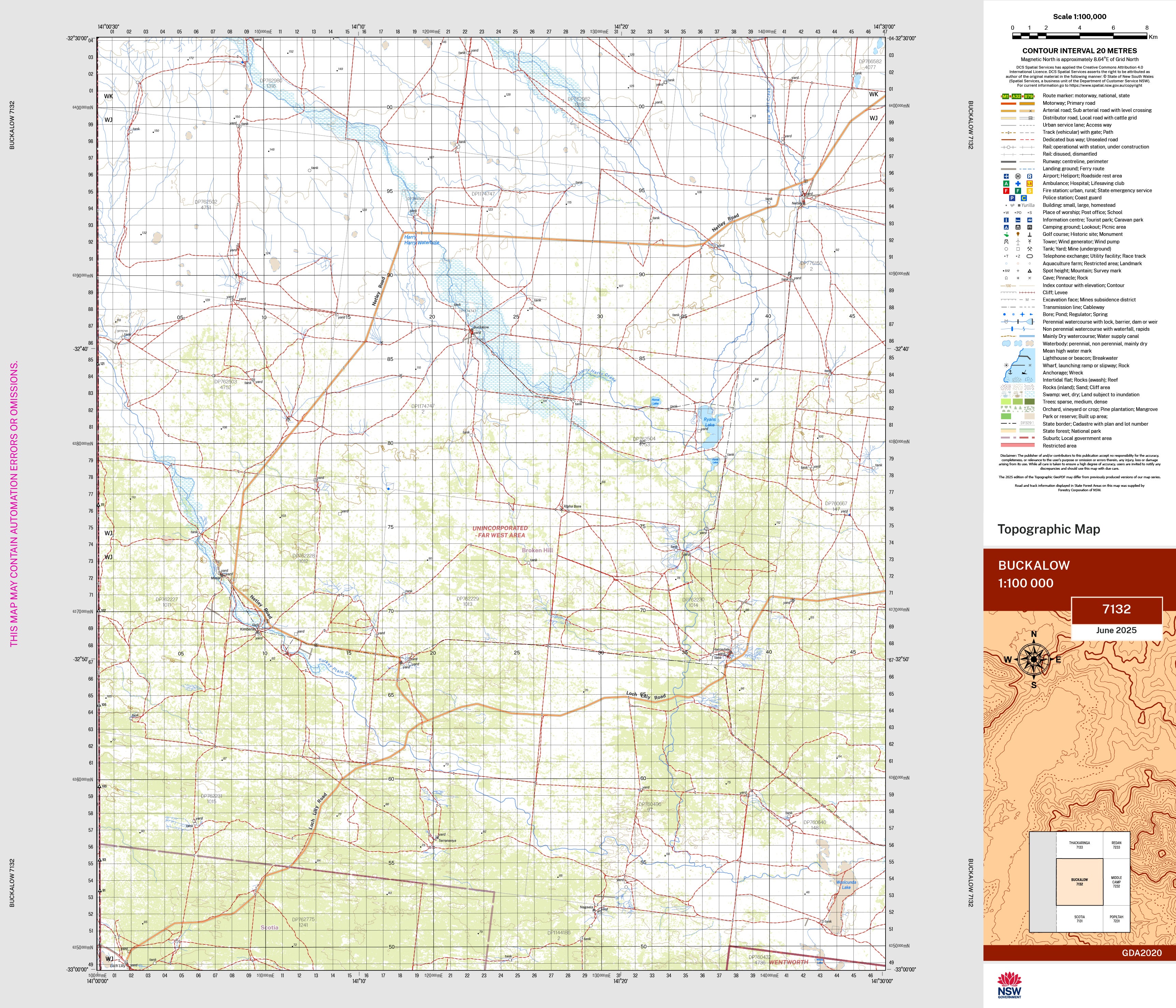 The Buckalow 1:100,000 scale New South Wales topographic map shows contours, streams, roads, tracks, buildings, place names, points of interest, vegetation, selected administrative boundaries and much more.