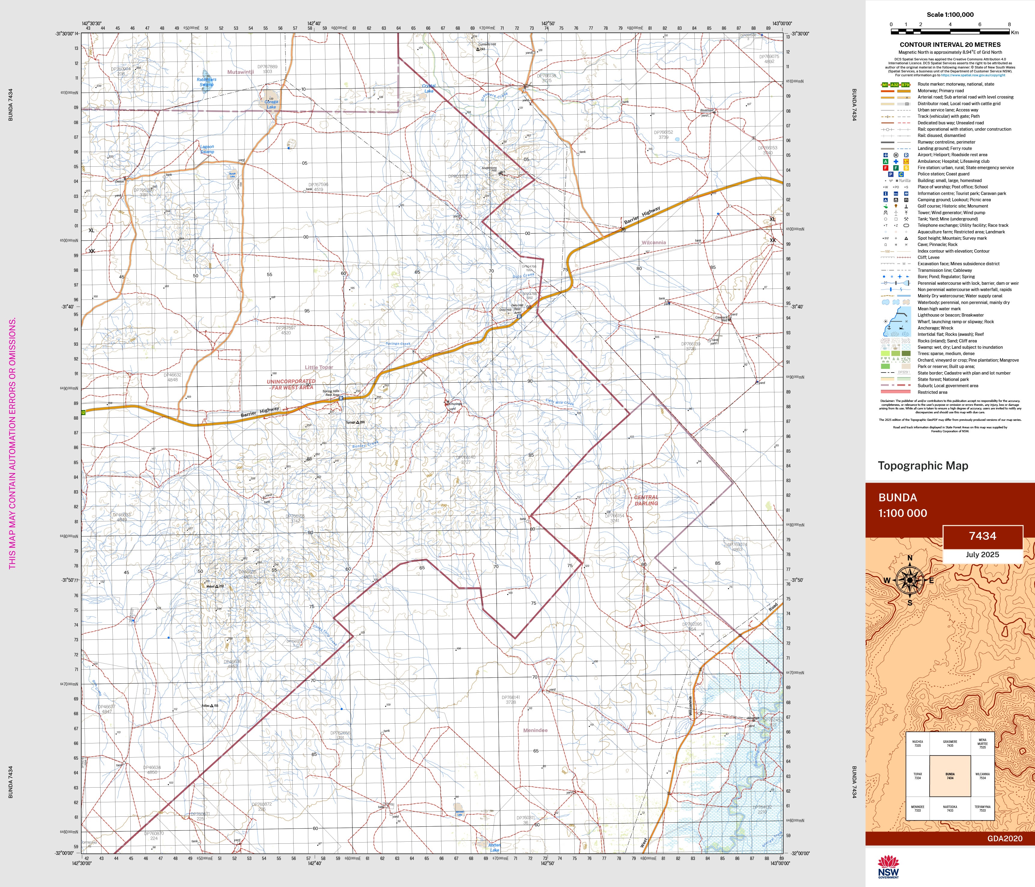The Bunda 1:100,000 scale New South Wales topographic map shows contours, streams, roads, tracks, buildings, place names, points of interest, vegetation, selected administrative boundaries and much more.