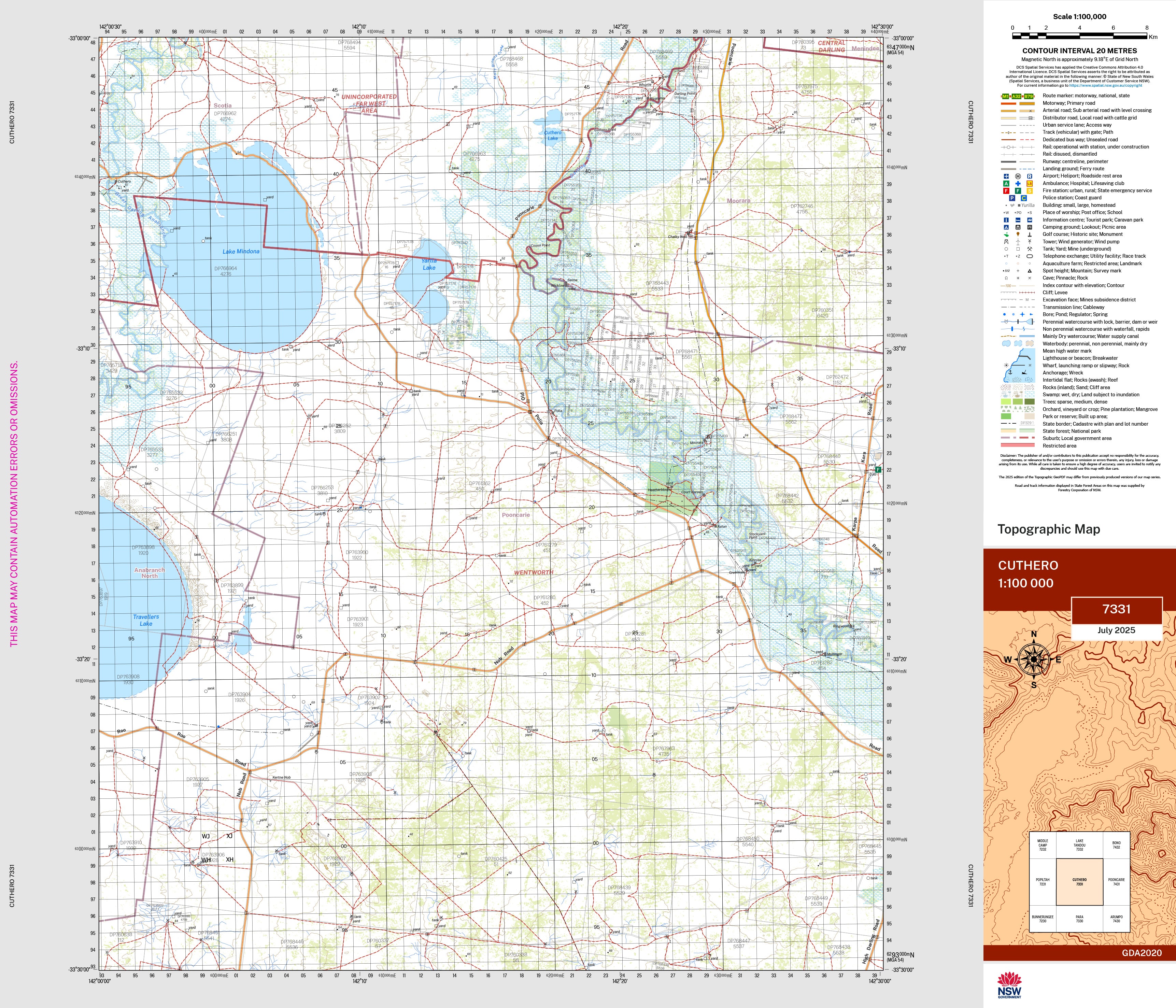 The Cuthero 1:100,000 scale New South Wales topographic map shows contours, streams, roads, tracks, buildings, place names, points of interest, vegetation, selected administrative boundaries and much more.