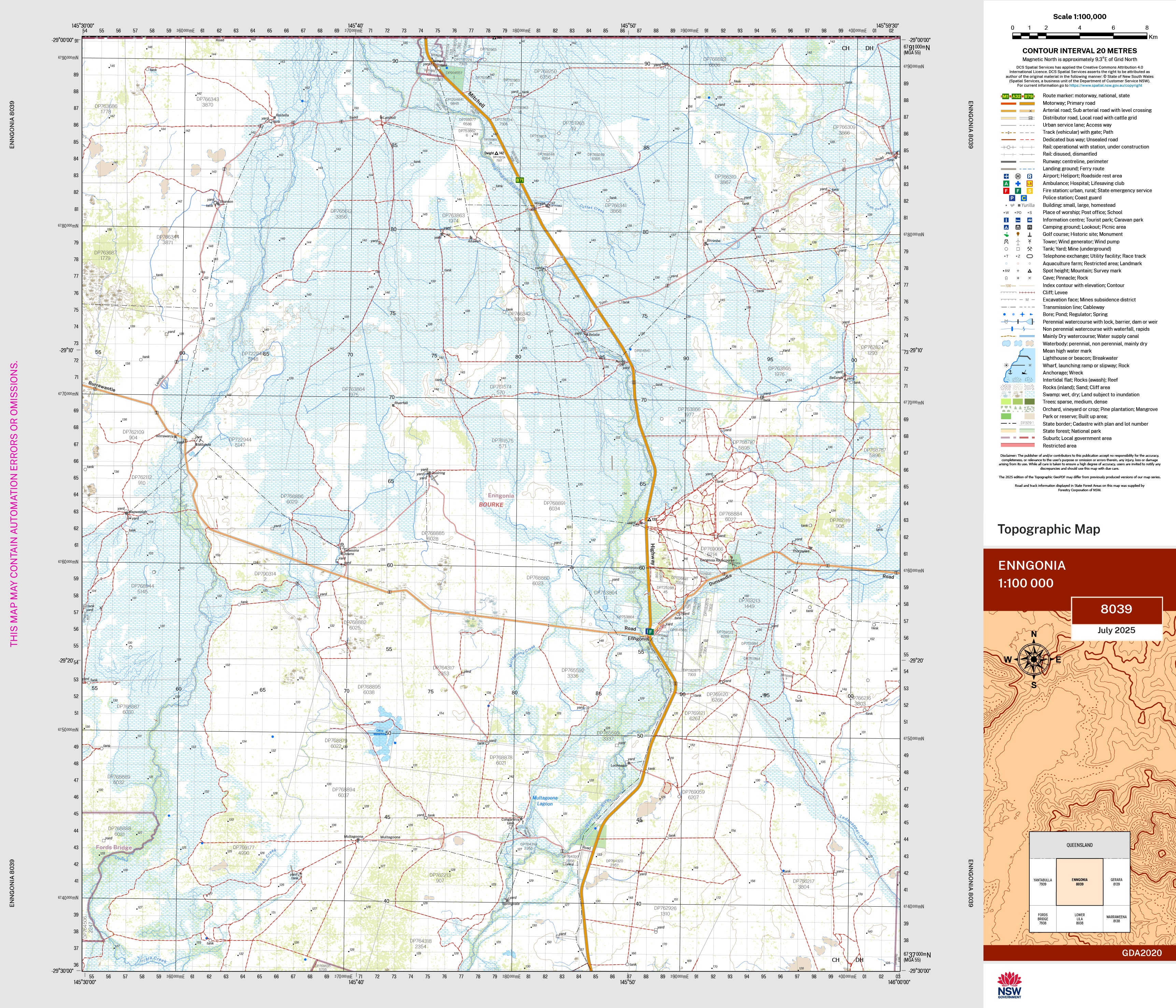 The Enngonia 1:100,000 scale New South Wales topographic map shows contours, streams, roads, tracks, buildings, place names, points of interest, vegetation, selected administrative boundaries and much more.
