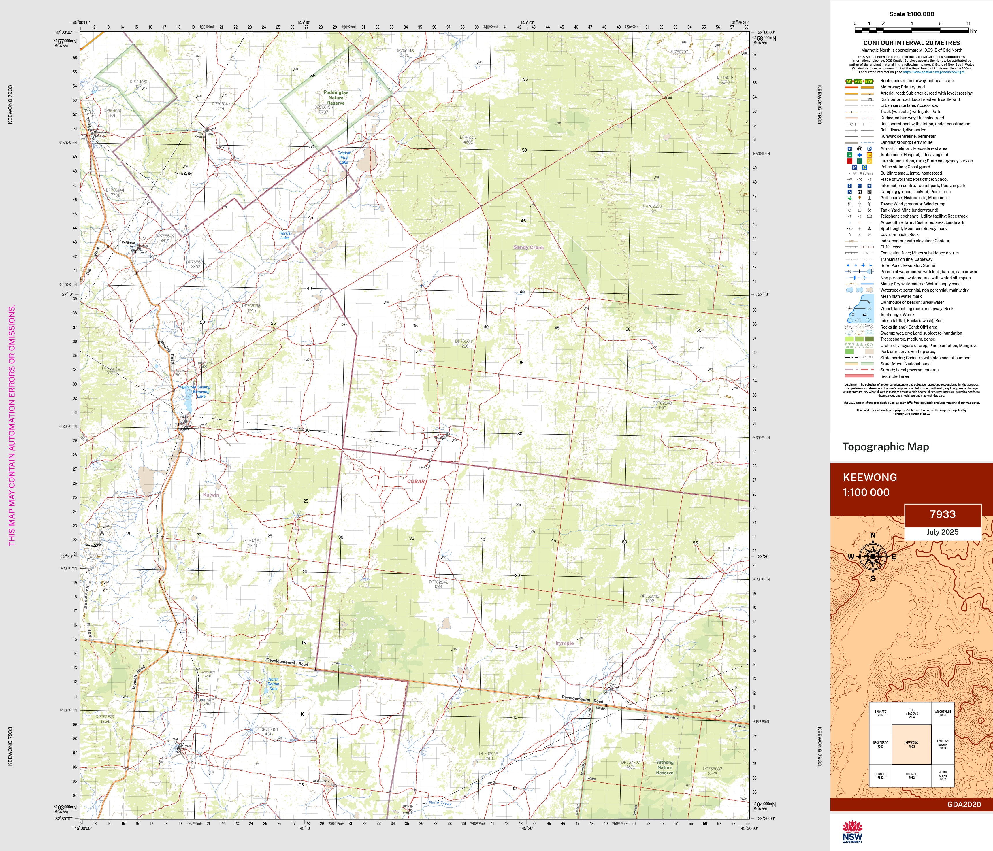 The Keewong 1:100,000 scale New South Wales topographic map shows contours, streams, roads, tracks, buildings, place names, points of interest, vegetation, selected administrative boundaries and much more.