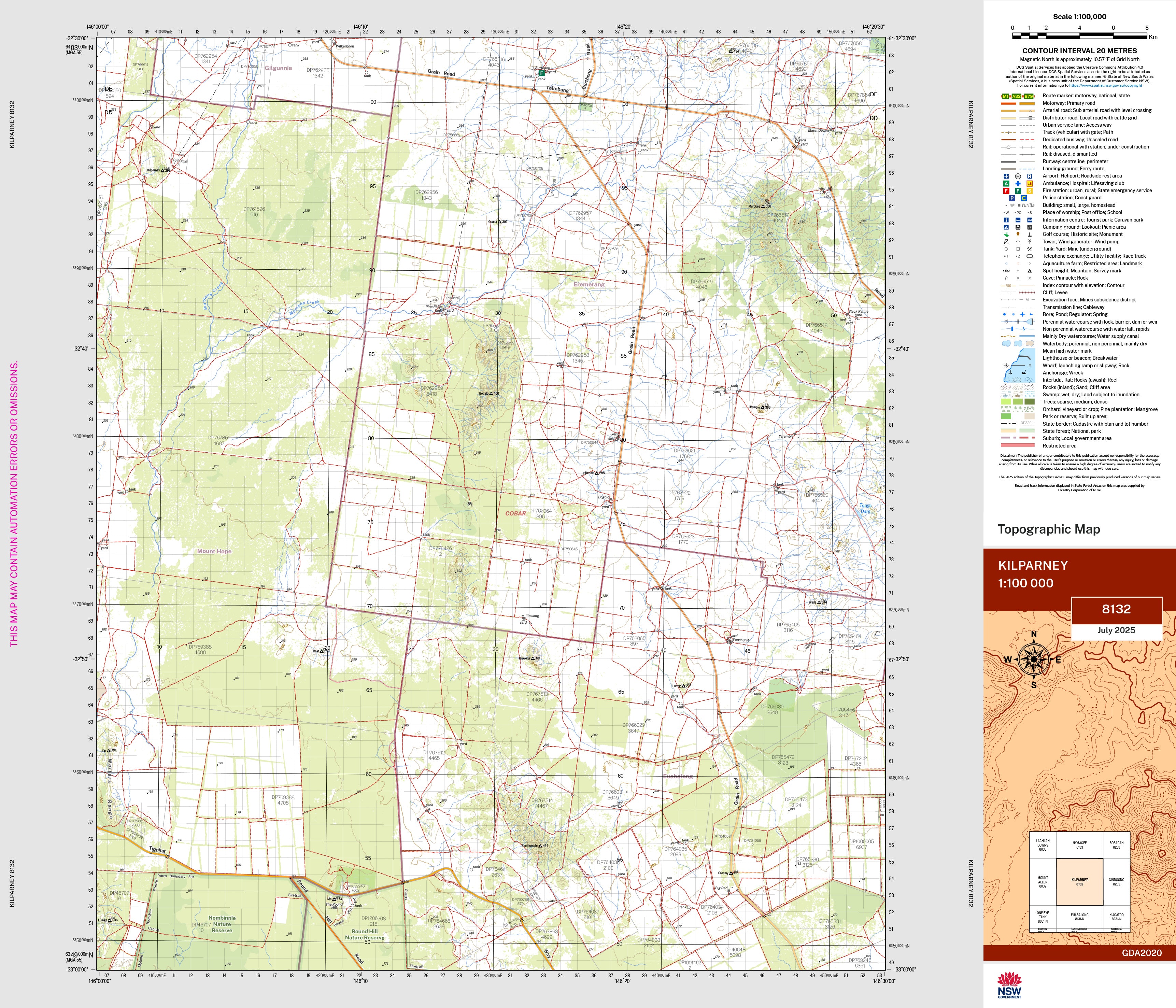 The Kilparney 1:100,000 scale New South Wales topographic map shows contours, streams, roads, tracks, buildings, place names, points of interest, vegetation, selected administrative boundaries and much more.