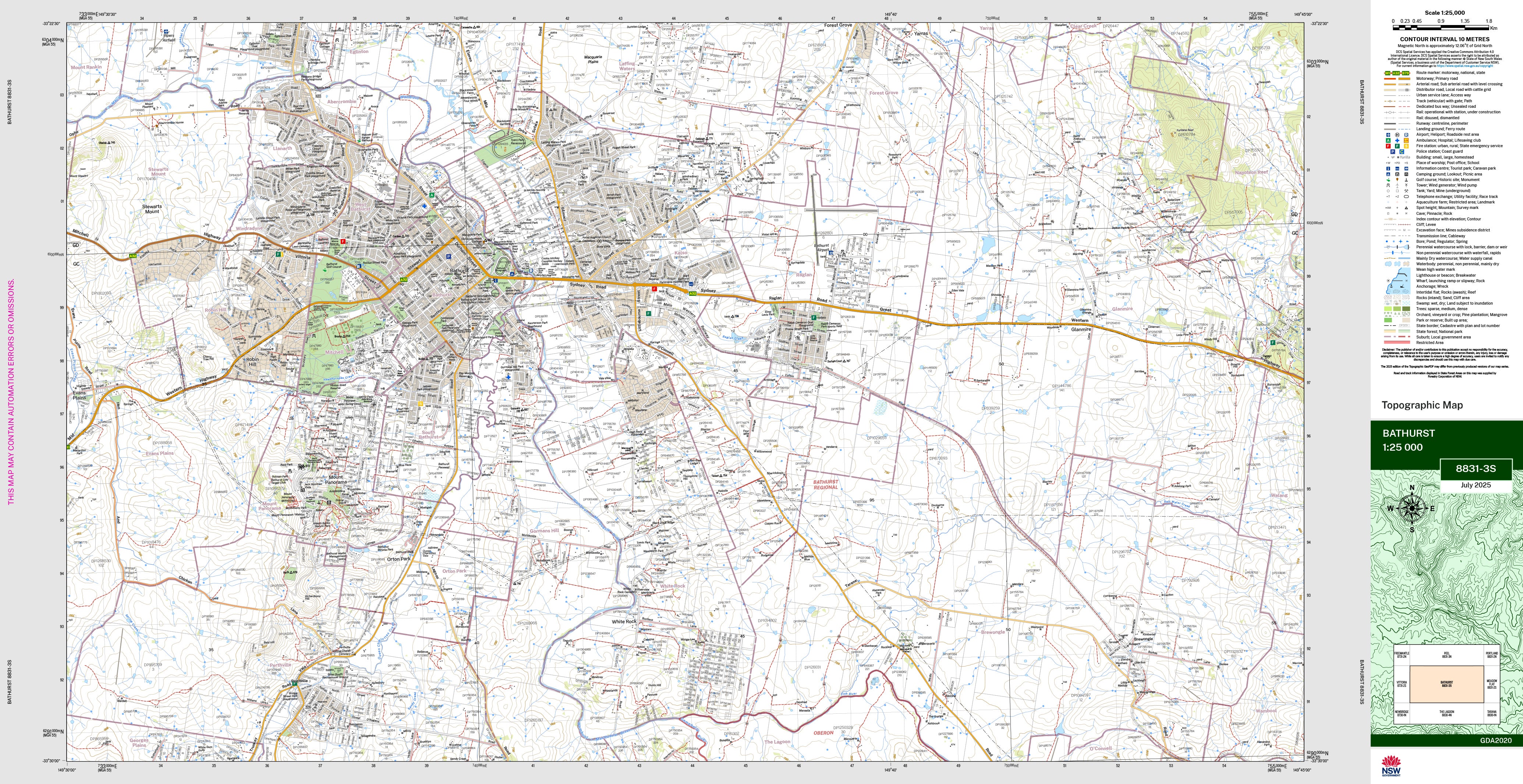 The Bathurst topographic map by LPI shows contours, streams, roads, tracks, buildings, place names, points of interest, vegetation, selected administrative boundaries and much more.