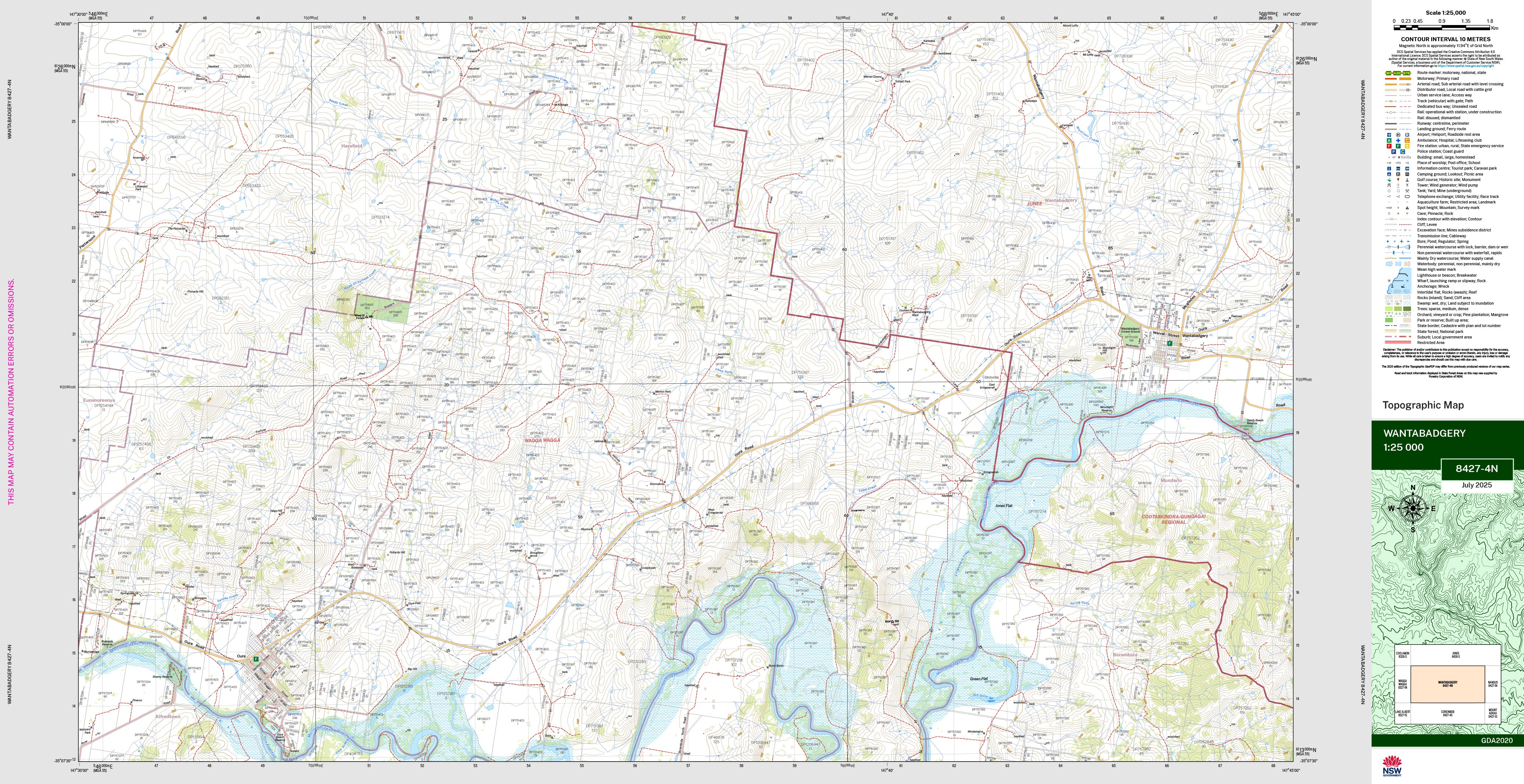 The Wantabadgery 1:25,000 scale New South Wales topographic map shows contours, streams, roads, tracks, buildings, place names, points of interest, vegetation, selected administrative boundaries and much more.