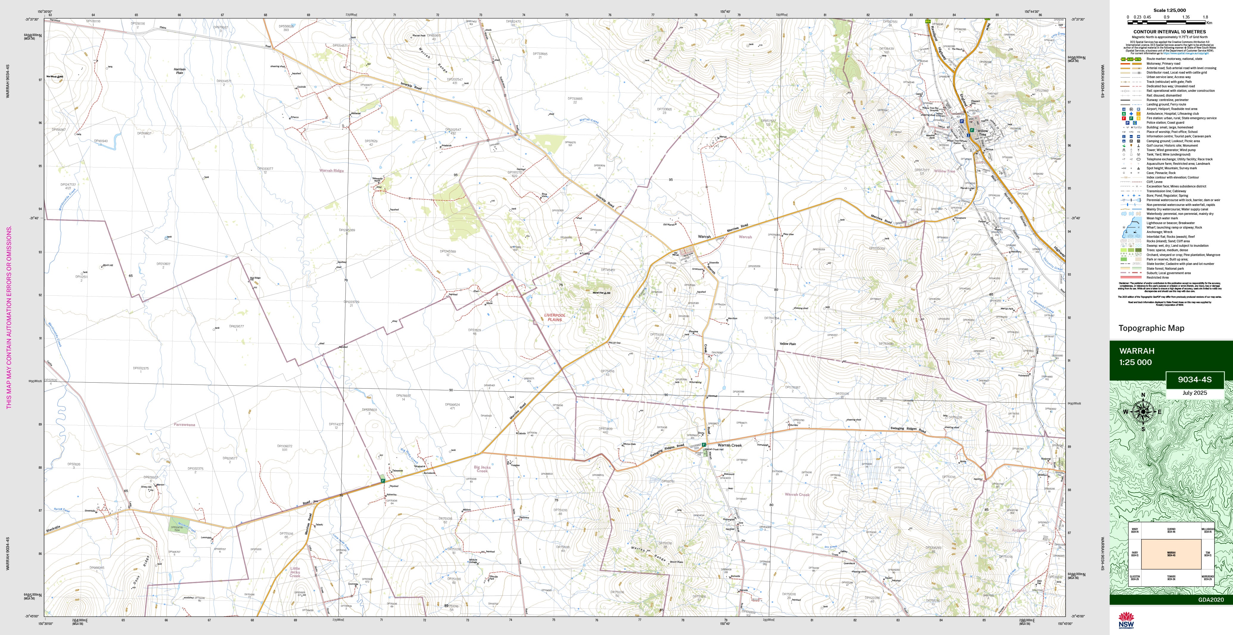 The Warrah 1:25,000 scale New South Wales topographic map shows contours, streams, roads, tracks, buildings, place names, points of interest, vegetation, selected administrative boundaries and much more.