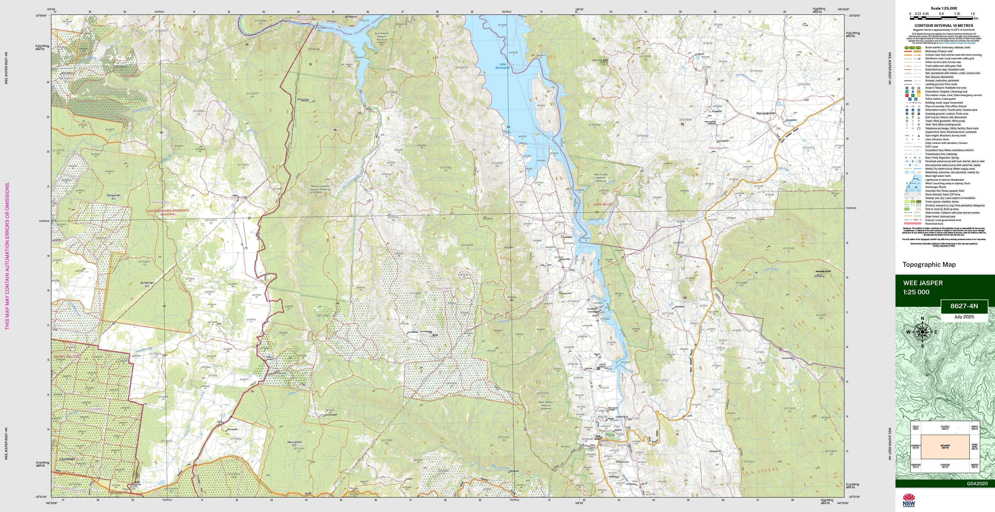 The Wee Jasper 1:25,000 scale New South Wales topographic map shows contours, streams, roads, tracks, buildings, place names, points of interest, vegetation, selected administrative boundaries and much more.