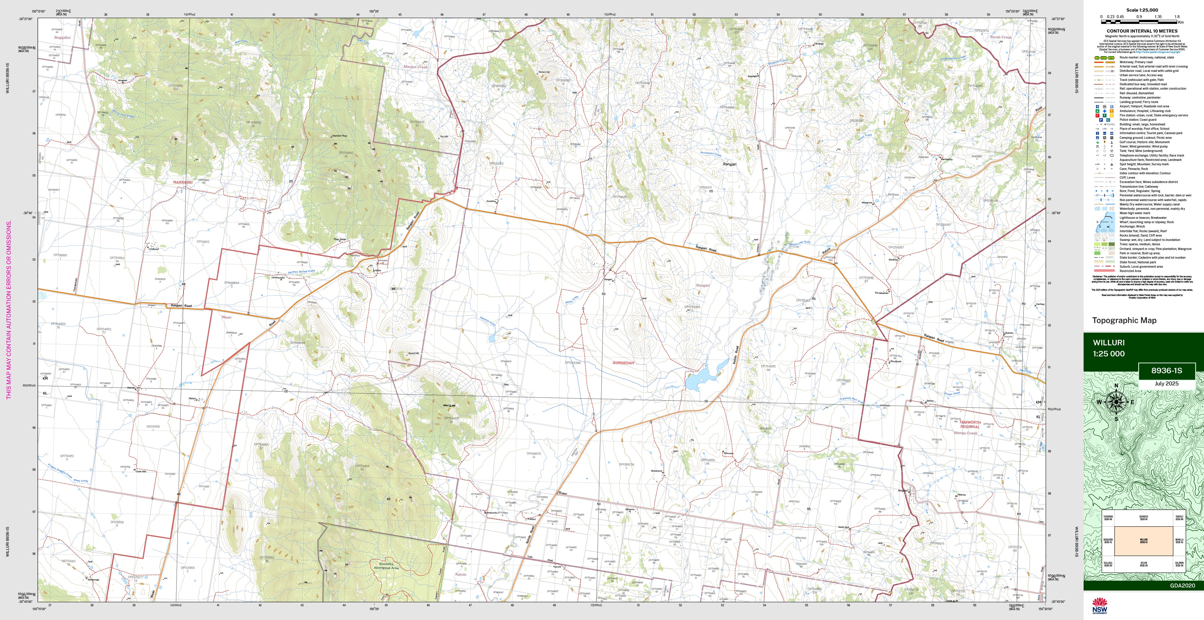 The Willuri 1:25,000 scale New South Wales topographic map shows contours, streams, roads, tracks, buildings, place names, points of interest, vegetation, selected administrative boundaries and much more.