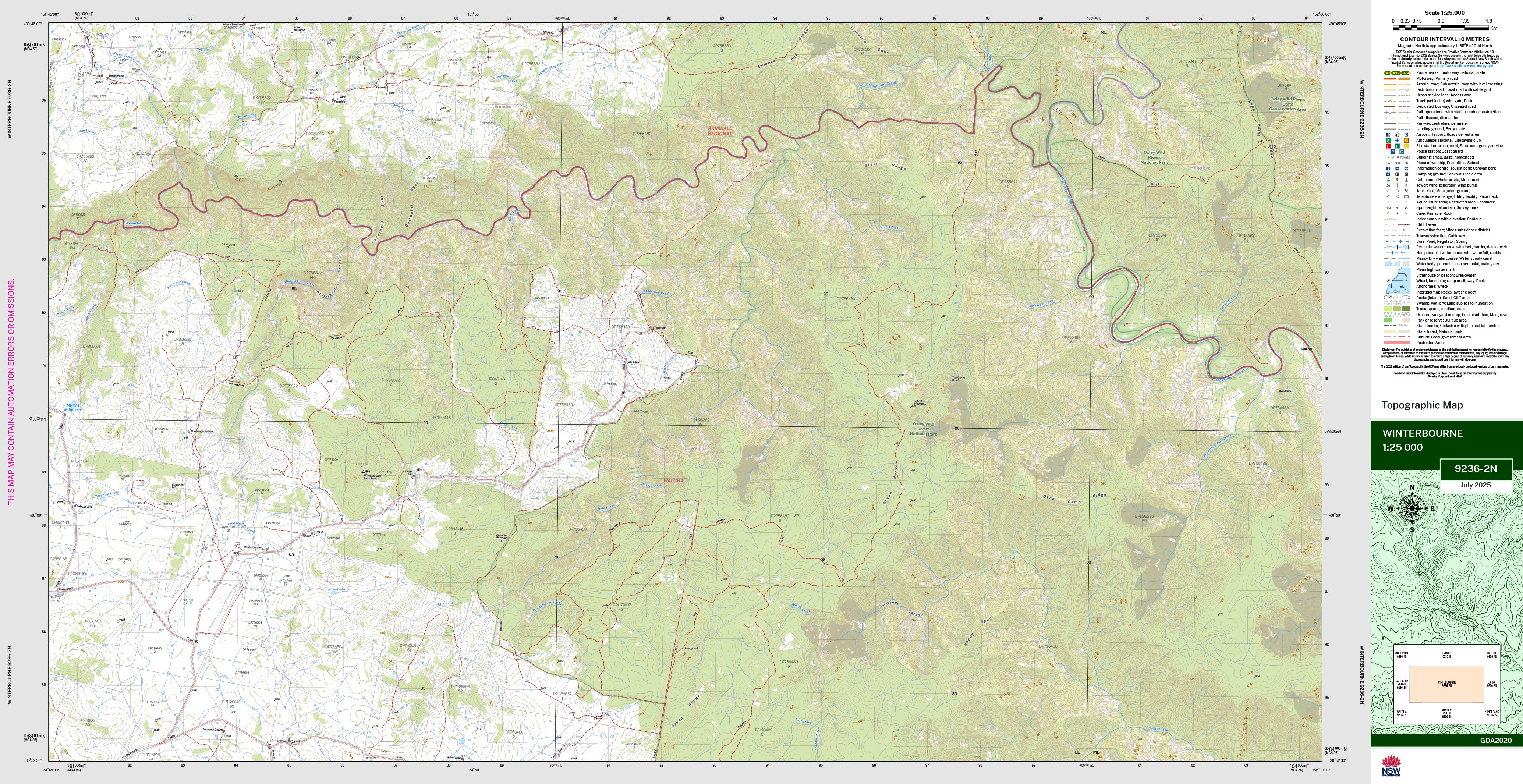 The Winterbourne 1:25,000 scale New South Wales topographic map shows contours, streams, roads, tracks, buildings, place names, points of interest, vegetation, selected administrative boundaries and much more.