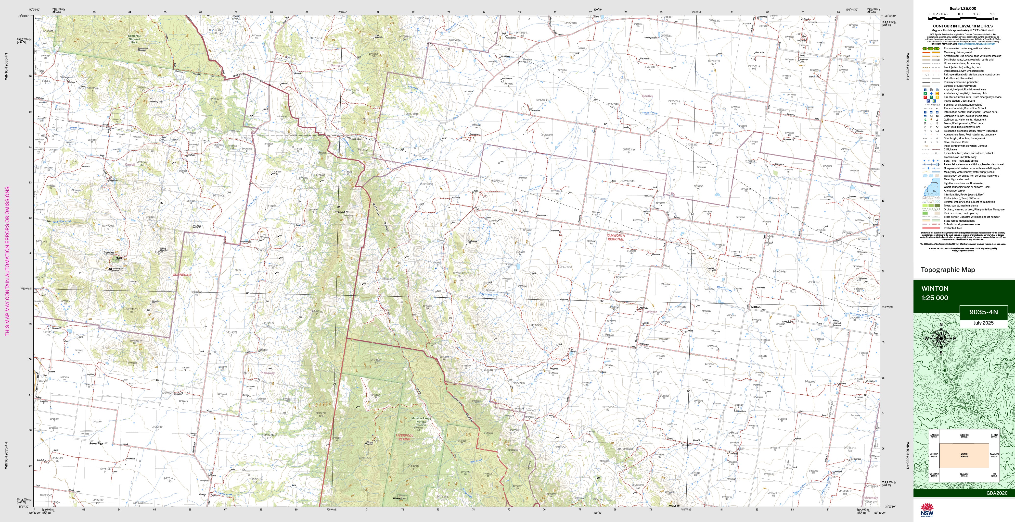 The Winton 1:25,000 scale New South Wales topographic map shows contours, streams, roads, tracks, buildings, place names, points of interest, vegetation, selected administrative boundaries and much more.
