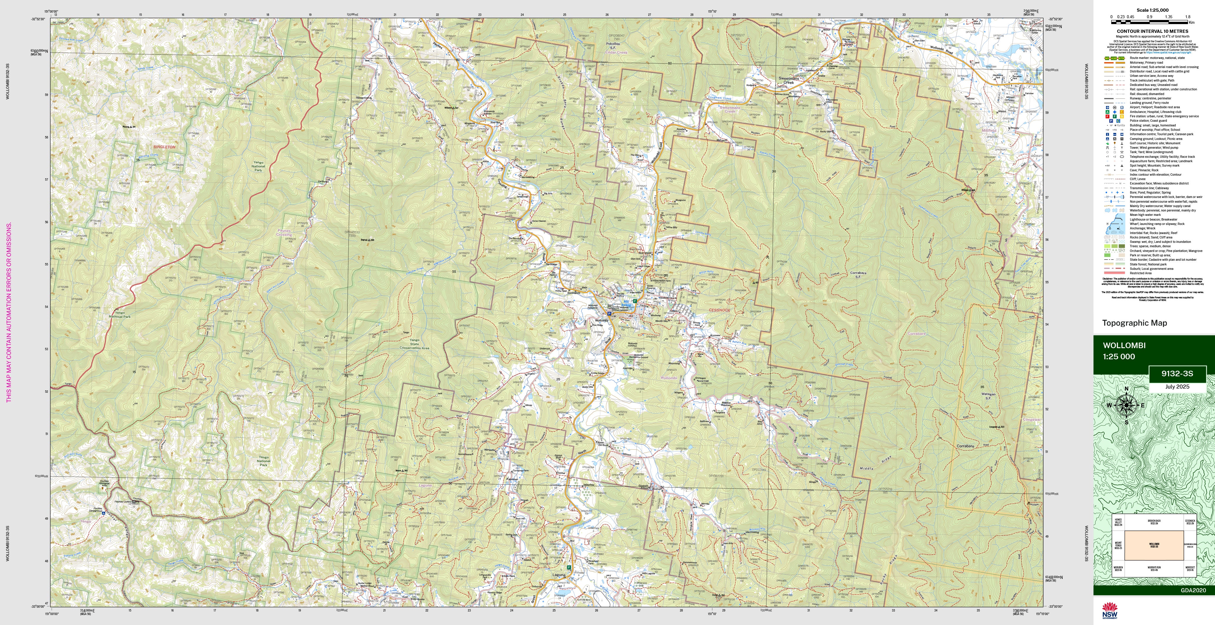 The Wollombi 1:25,000 scale New South Wales topographic map shows contours, streams, roads, tracks, buildings, place names, points of interest, vegetation, selected administrative boundaries and much more.