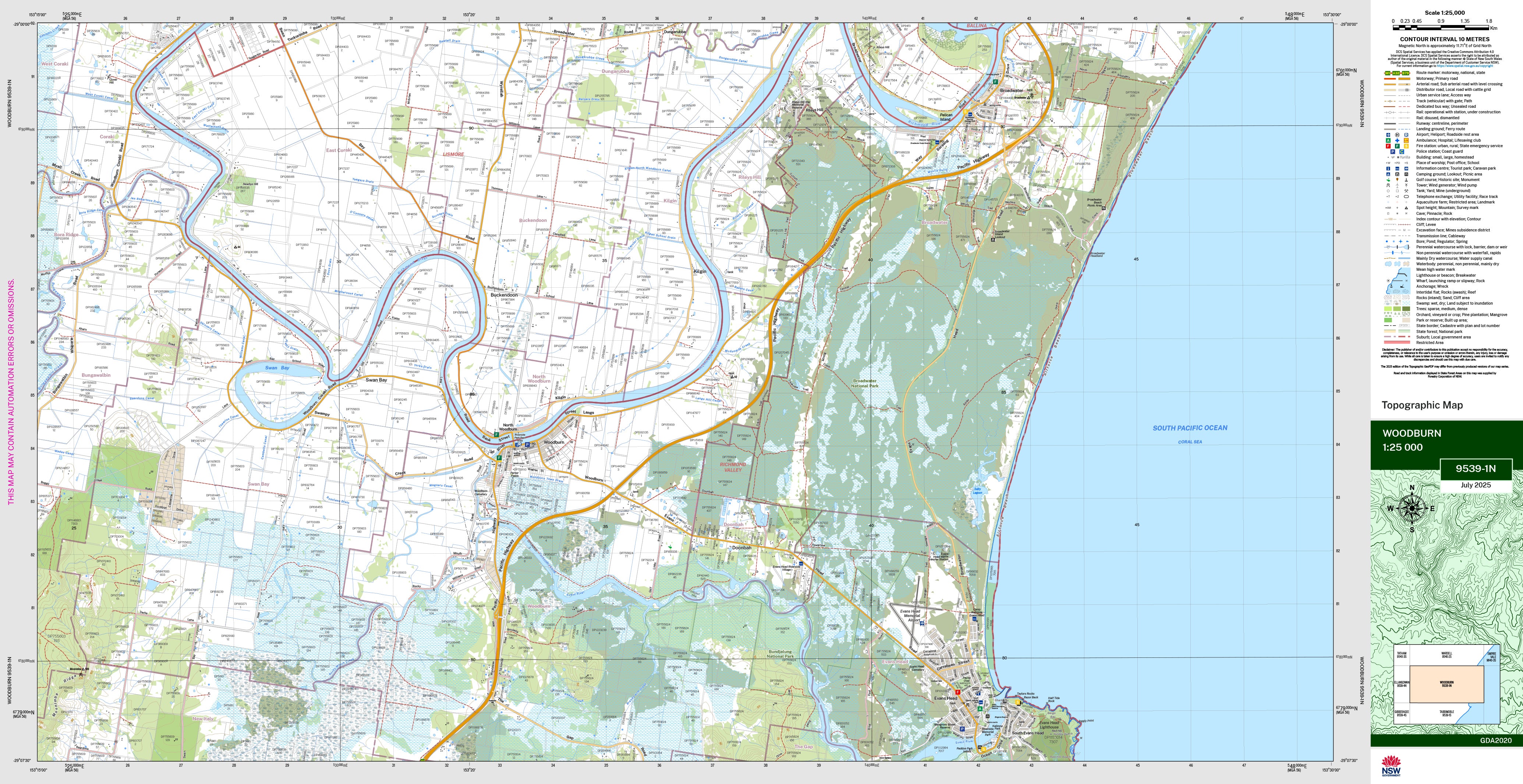 The Woodburn 1:25,000 scale New South Wales topographic map shows contours, streams, roads, tracks, buildings, place names, points of interest, vegetation, selected administrative boundaries and much more.