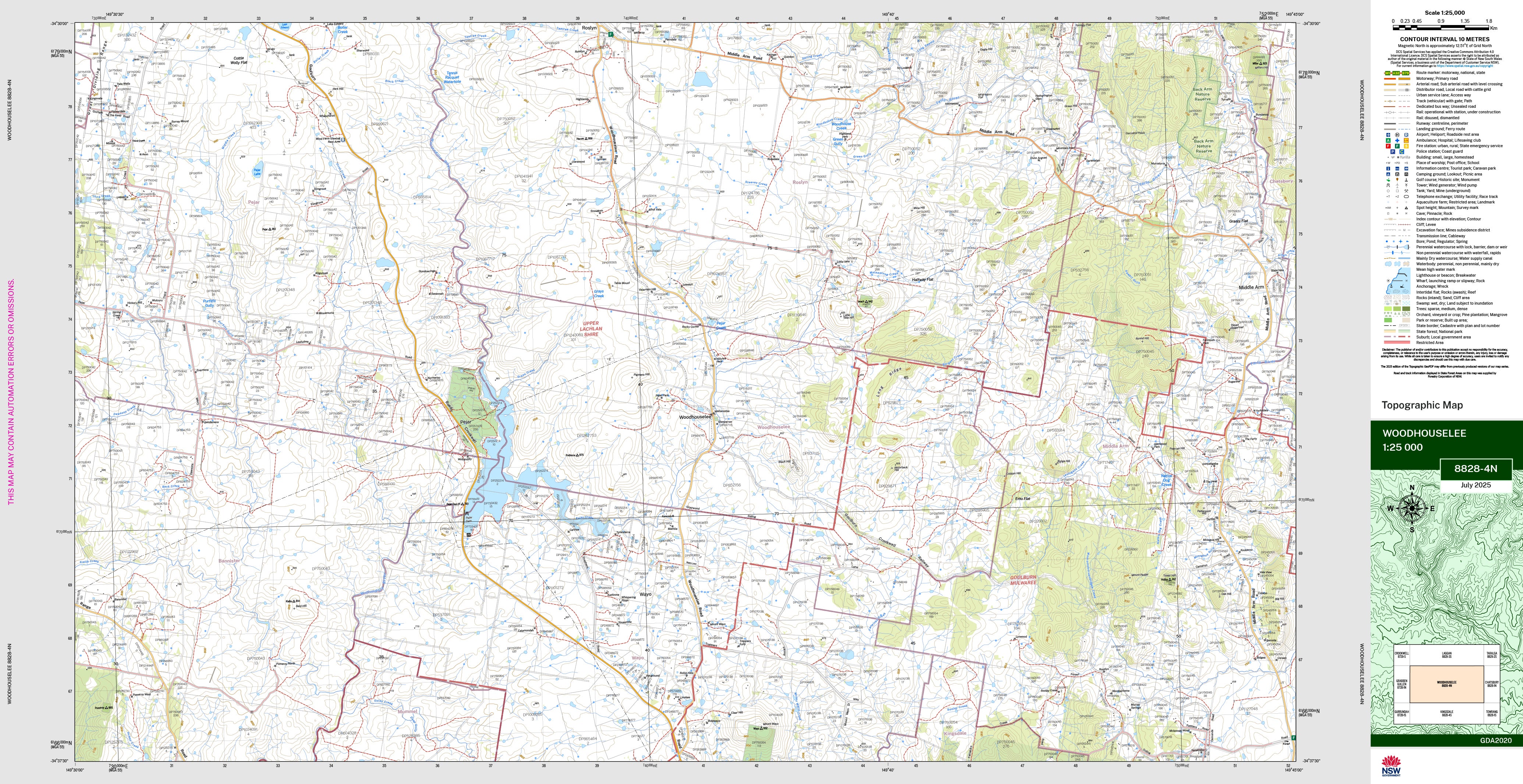 The Woodhouselee 1:25,000 scale New South Wales topographic map shows contours, streams, roads, tracks, buildings, place names, points of interest, vegetation, selected administrative boundaries and much more.
