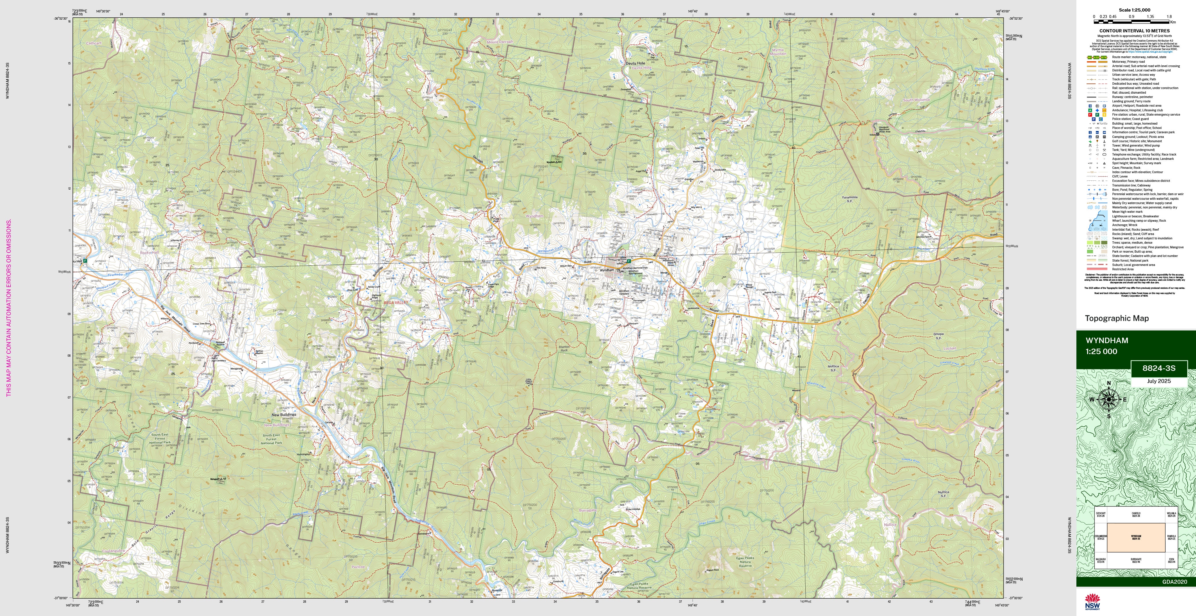 The Wyndham 1:25,000 scale New South Wales topographic map shows contours, streams, roads, tracks, buildings, place names, points of interest, vegetation, selected administrative boundaries and much more.