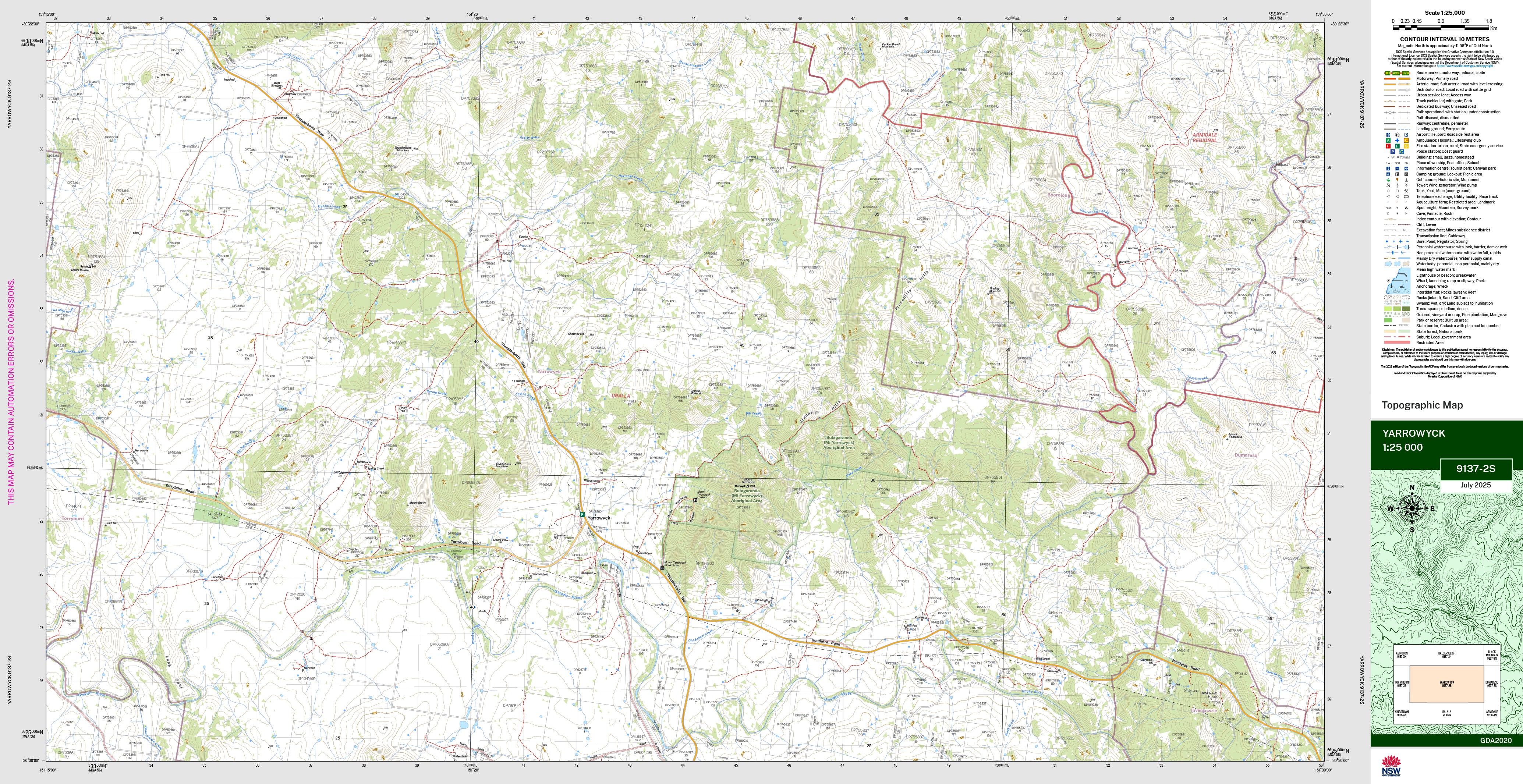 The Yarrowyck 1:25,000 scale New South Wales topographic map shows contours, streams, roads, tracks, buildings, place names, points of interest, vegetation, selected administrative boundaries and much more.