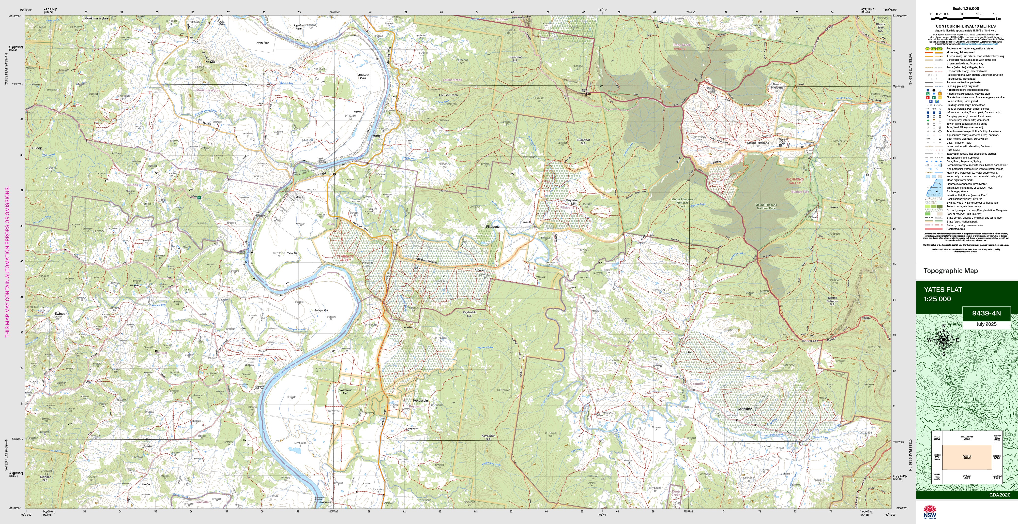 The Yates Flat 1:25,000 scale New South Wales topographic map shows contours, streams, roads, tracks, buildings, place names, points of interest, vegetation, selected administrative boundaries and much more.
