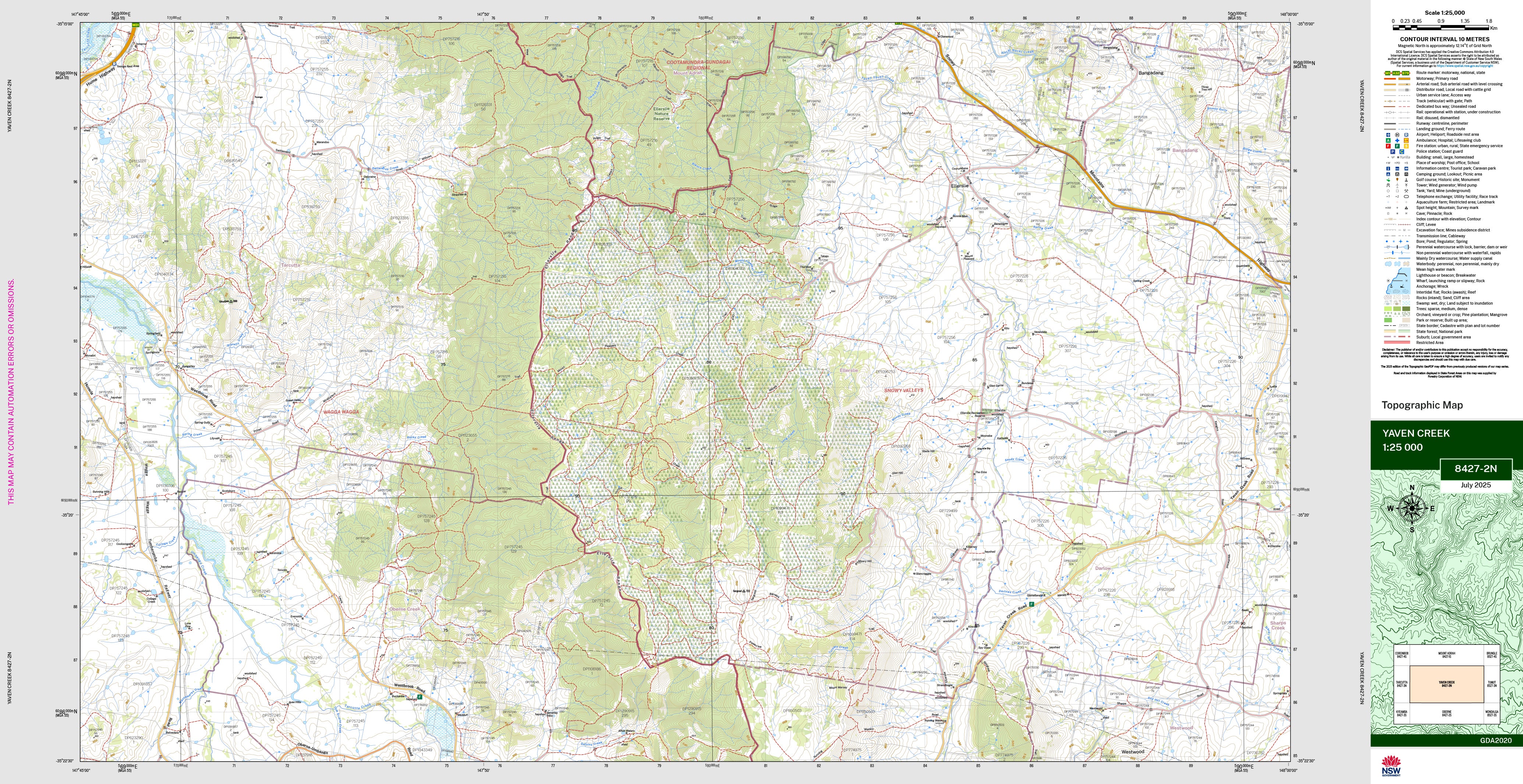 The Yaven Creek 1:25,000 scale New South Wales topographic map shows contours, streams, roads, tracks, buildings, place names, points of interest, vegetation, selected administrative boundaries and much more.