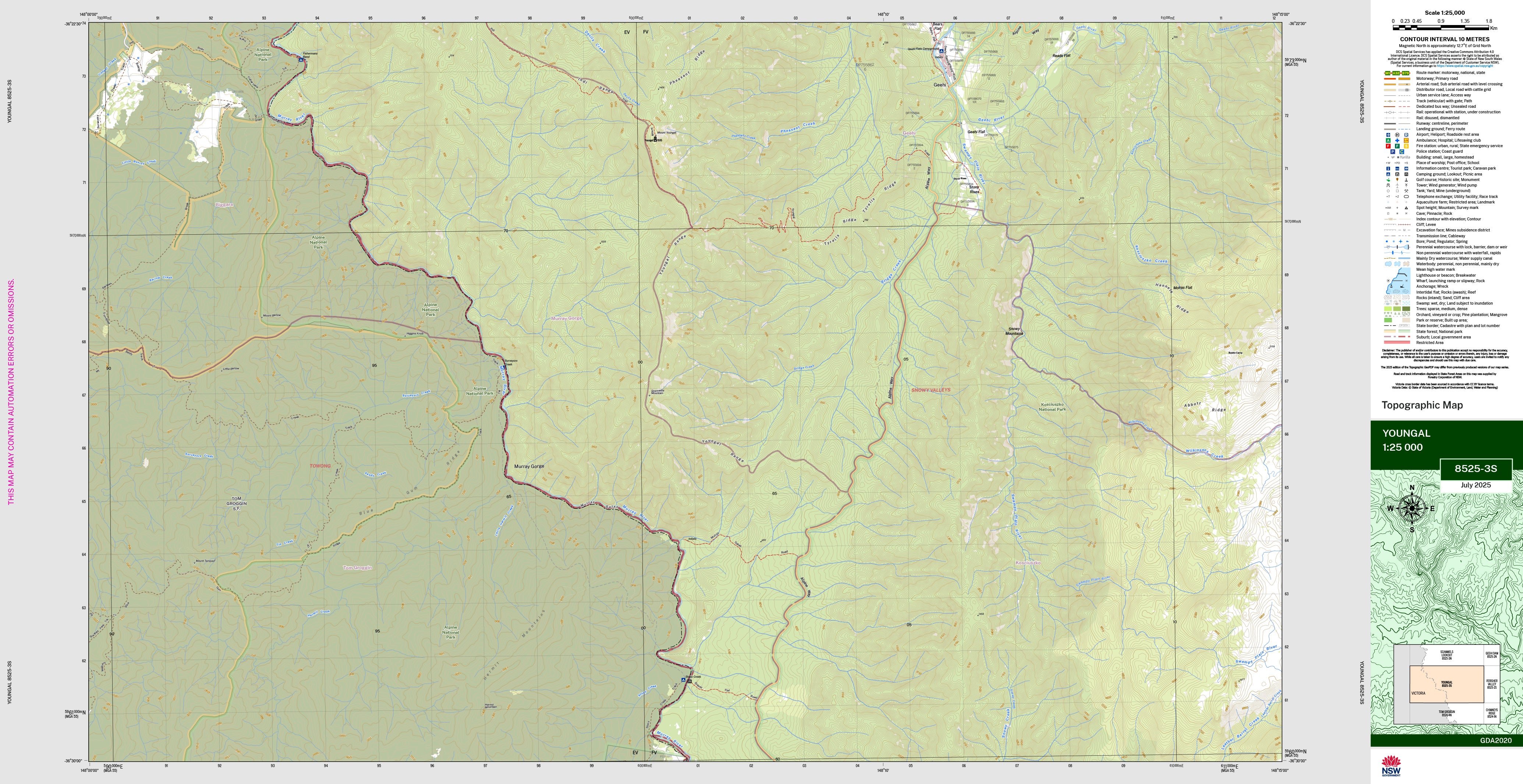 The Youngal 1:25,000 scale New South Wales topographic map shows contours, streams, roads, tracks, buildings, place names, points of interest, vegetation, selected administrative boundaries and much more.