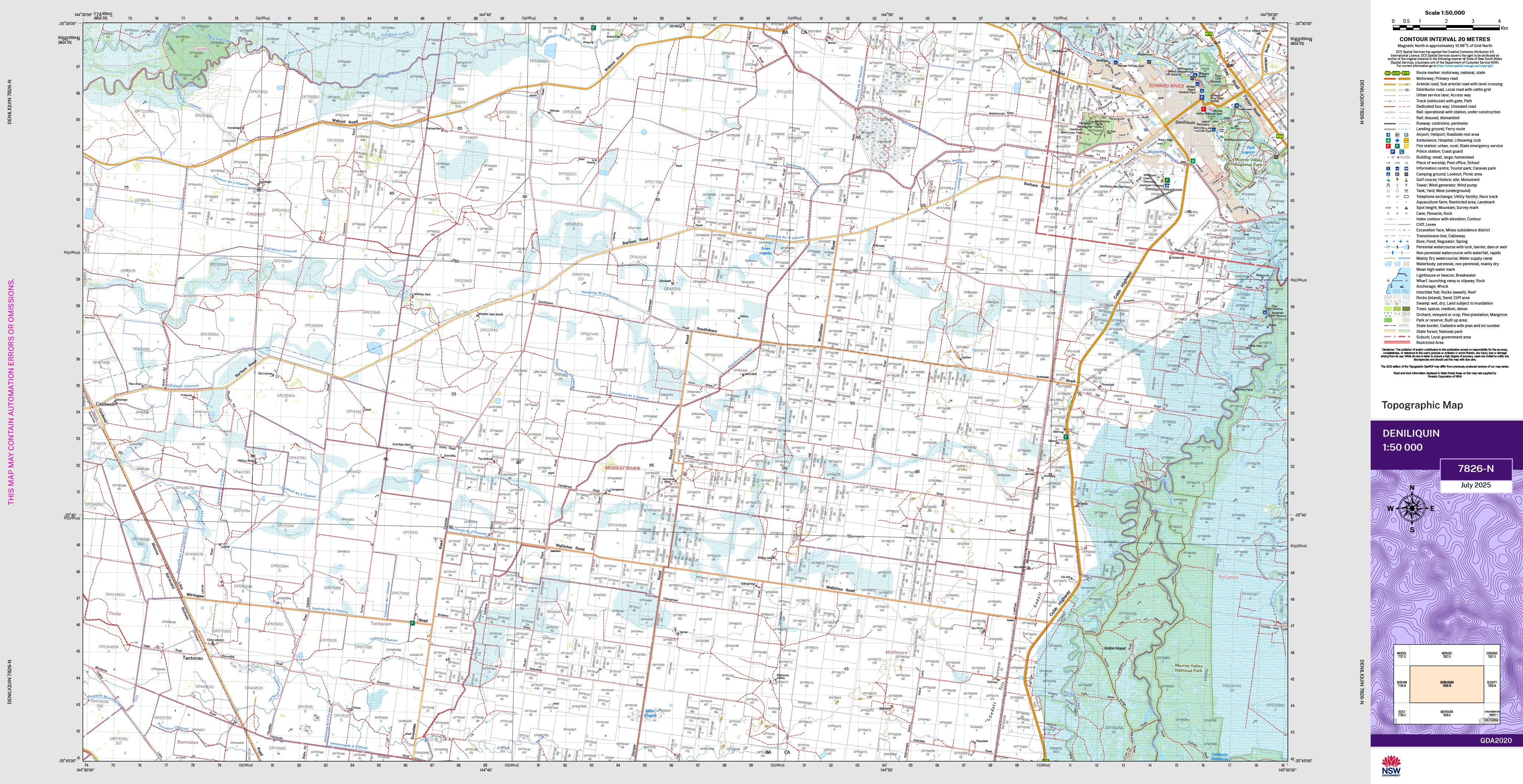 The Deniliquin 1:50,000 scale New South Wales topographic map shows contours, streams, roads, tracks, buildings, place names, points of interest, vegetation, selected administrative boundaries and much more.