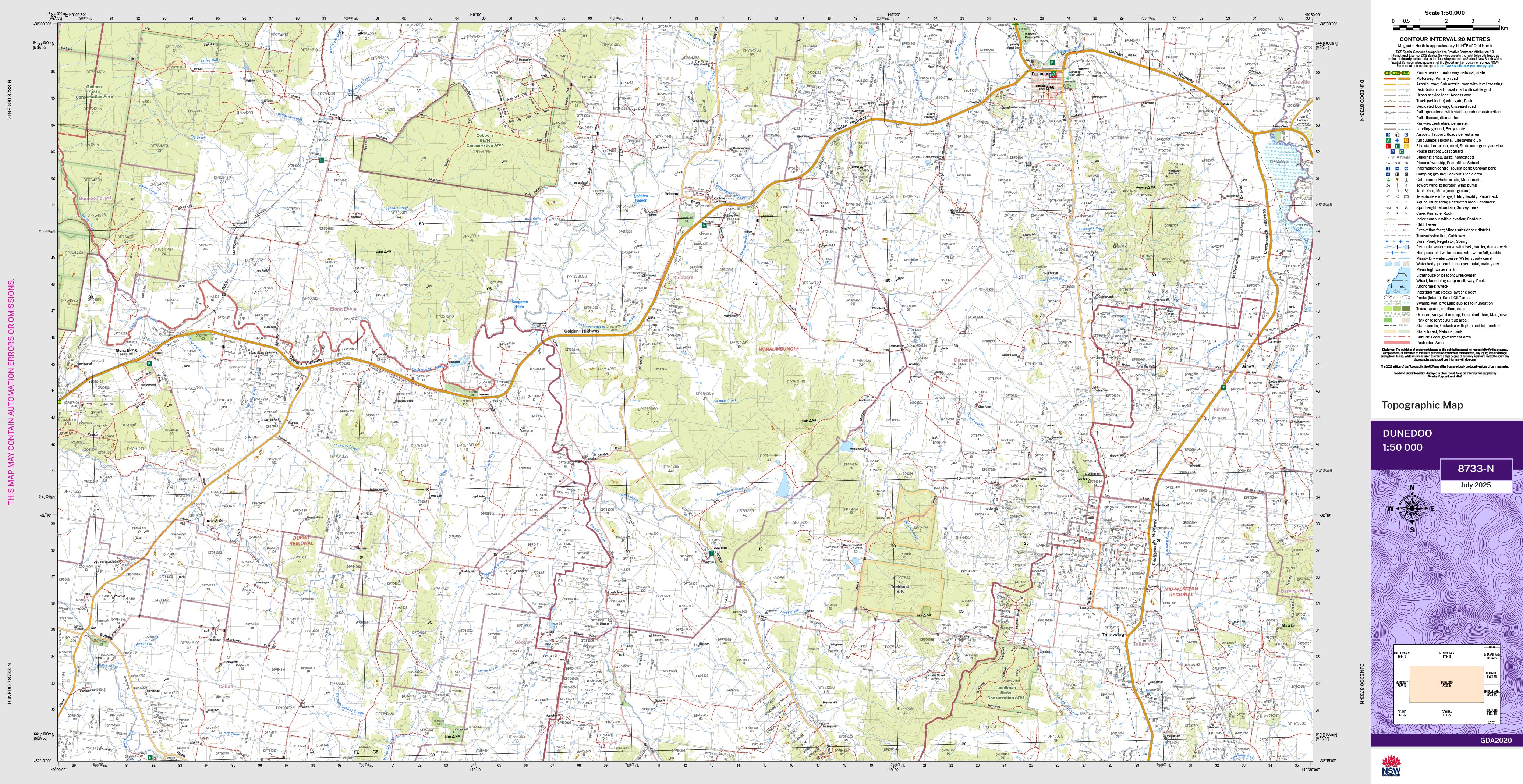 The Dunedoo 1:50,000 scale New South Wales topographic map shows contours, streams, roads, tracks, buildings, place names, points of interest, vegetation, selected administrative boundaries and much more.