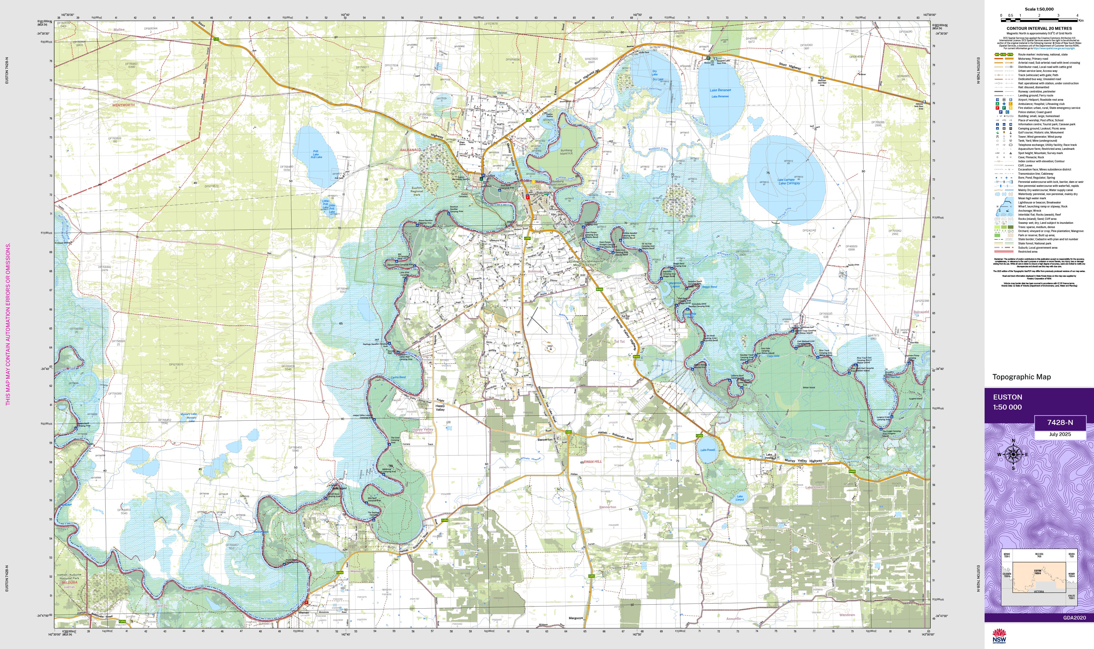 The Euston 1:50,000 scale New South Wales topographic map shows contours, streams, roads, tracks, buildings, place names, points of interest, vegetation, selected administrative boundaries and much more.