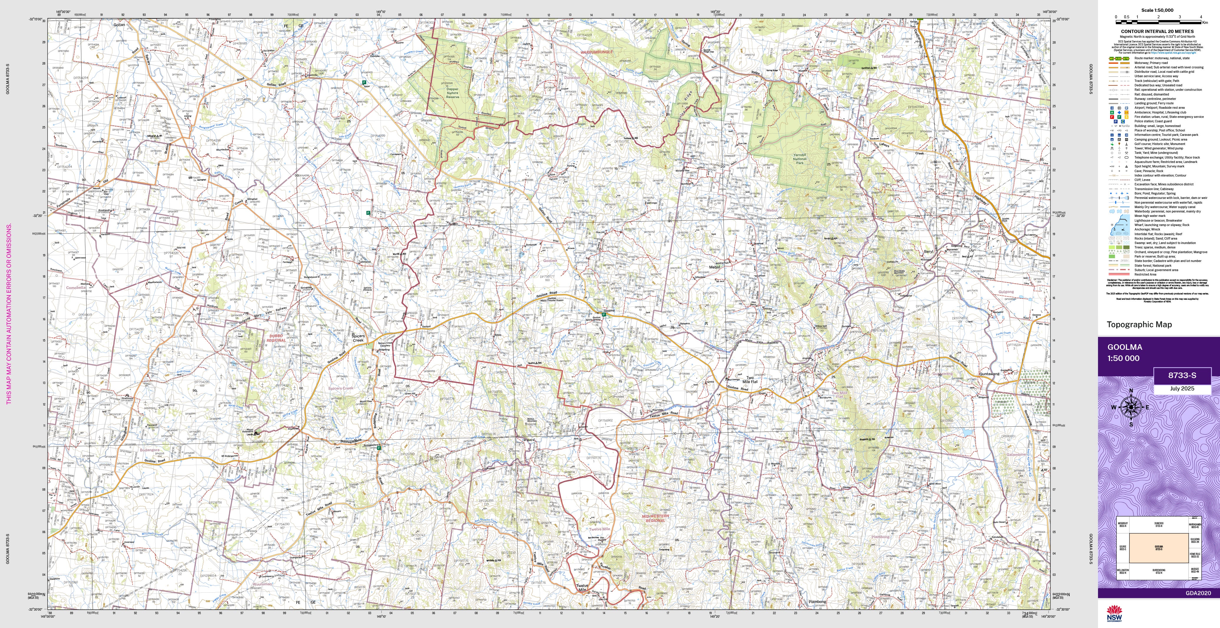 The Goolma 1:50,000 scale New South Wales topographic map shows contours, streams, roads, tracks, buildings, place names, points of interest, vegetation, selected administrative boundaries and much more.