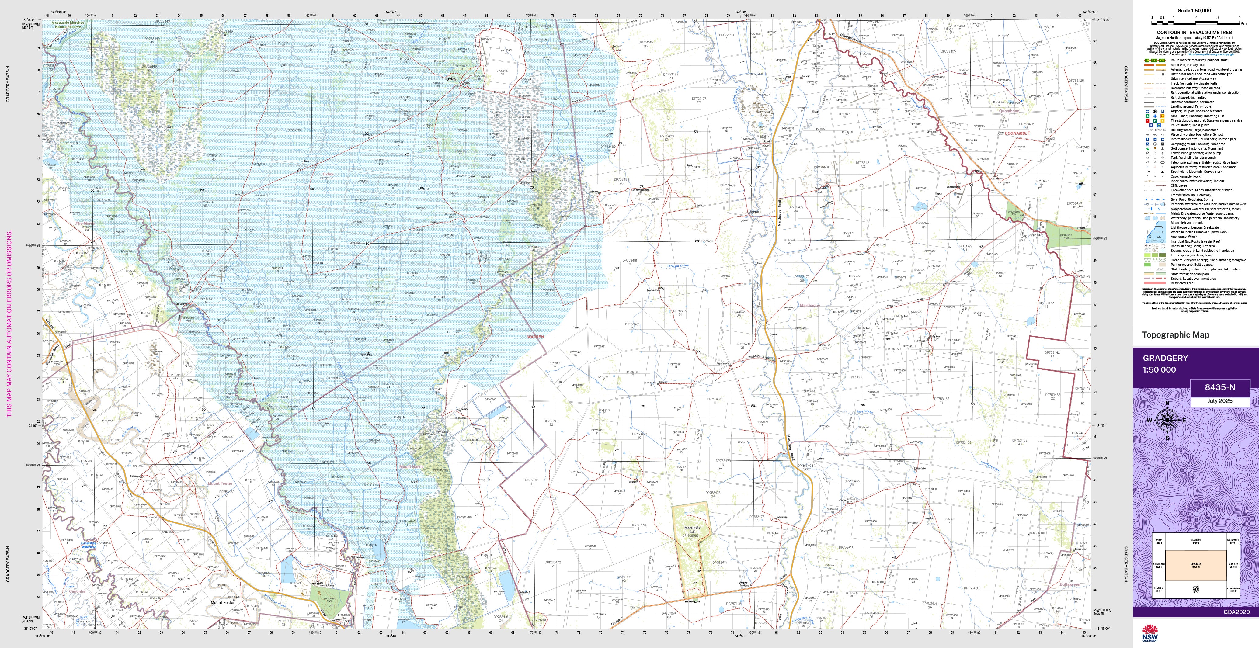 The Gradgery 1:50,000 scale New South Wales topographic map shows contours, streams, roads, tracks, buildings, place names, points of interest, vegetation, selected administrative boundaries and much more.
