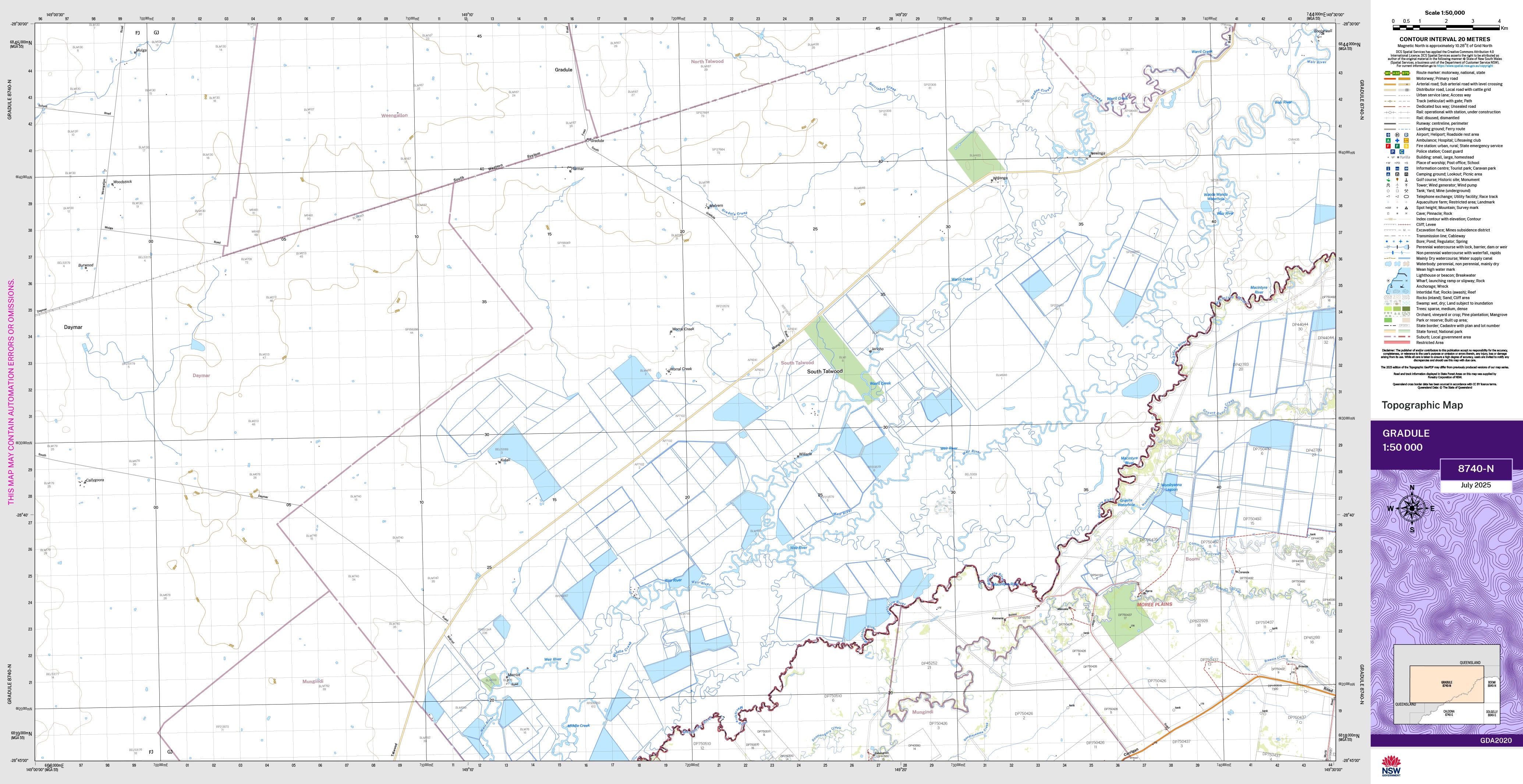 The Gradule 1:50,000 scale New South Wales topographic map shows contours, streams, roads, tracks, buildings, place names, points of interest, vegetation, selected administrative boundaries and much more.