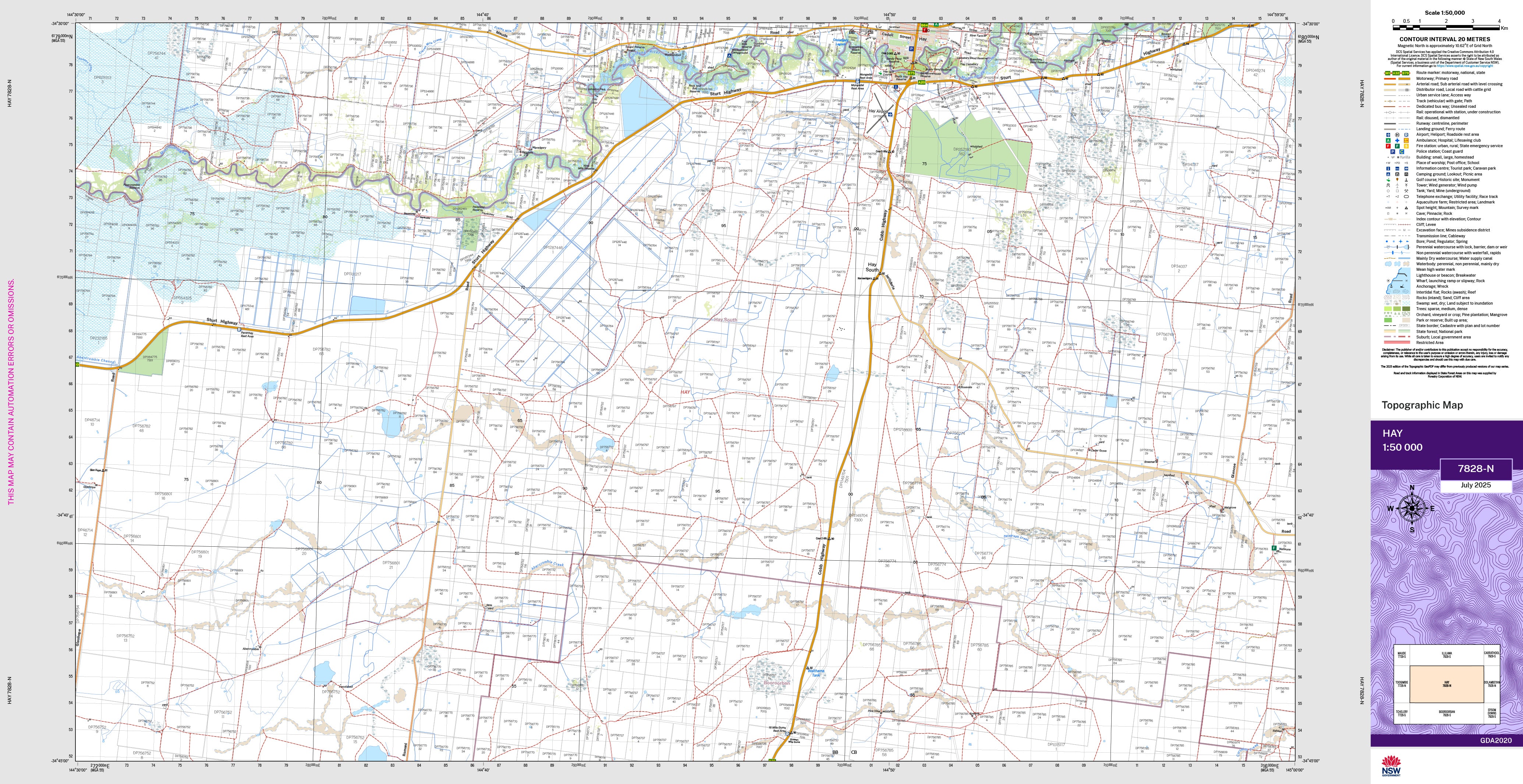 The Hay 1:50,000 scale New South Wales topographic map shows contours, streams, roads, tracks, buildings, place names, points of interest, vegetation, selected administrative boundaries and much more.