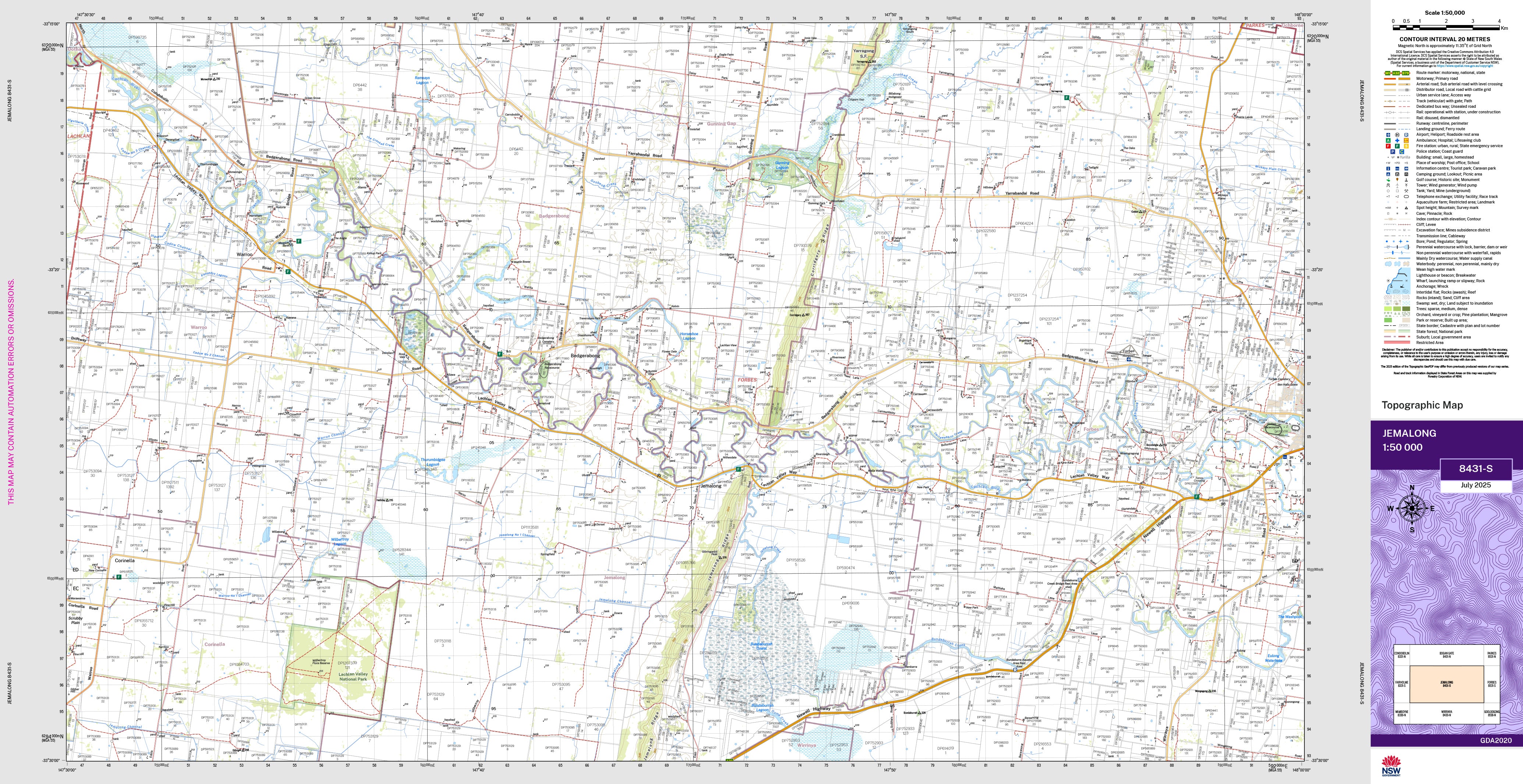 The Jemalong 1:50,000 scale New South Wales topographic map displays contours, streams, roads, tracks, buildings, place names, points of interest, vegetation, selected administrative boundaries, and more.