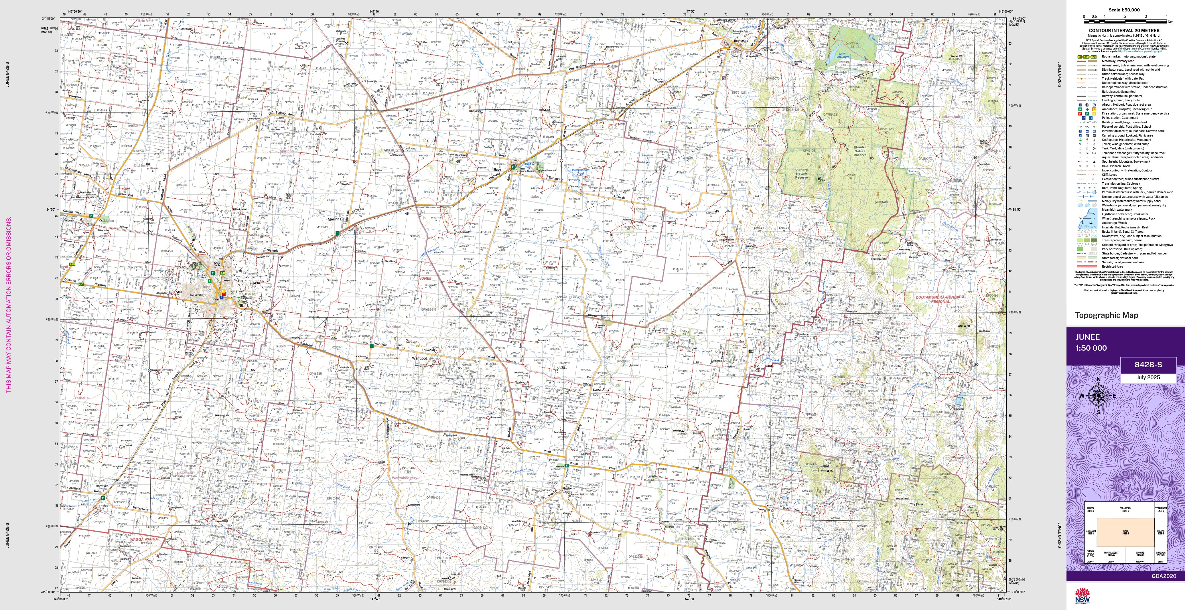 The Junee 1:50,000 scale New South Wales topographic map shows contours, streams, roads, tracks, buildings, place names, points of interest, vegetation, selected administrative boundaries and much more.