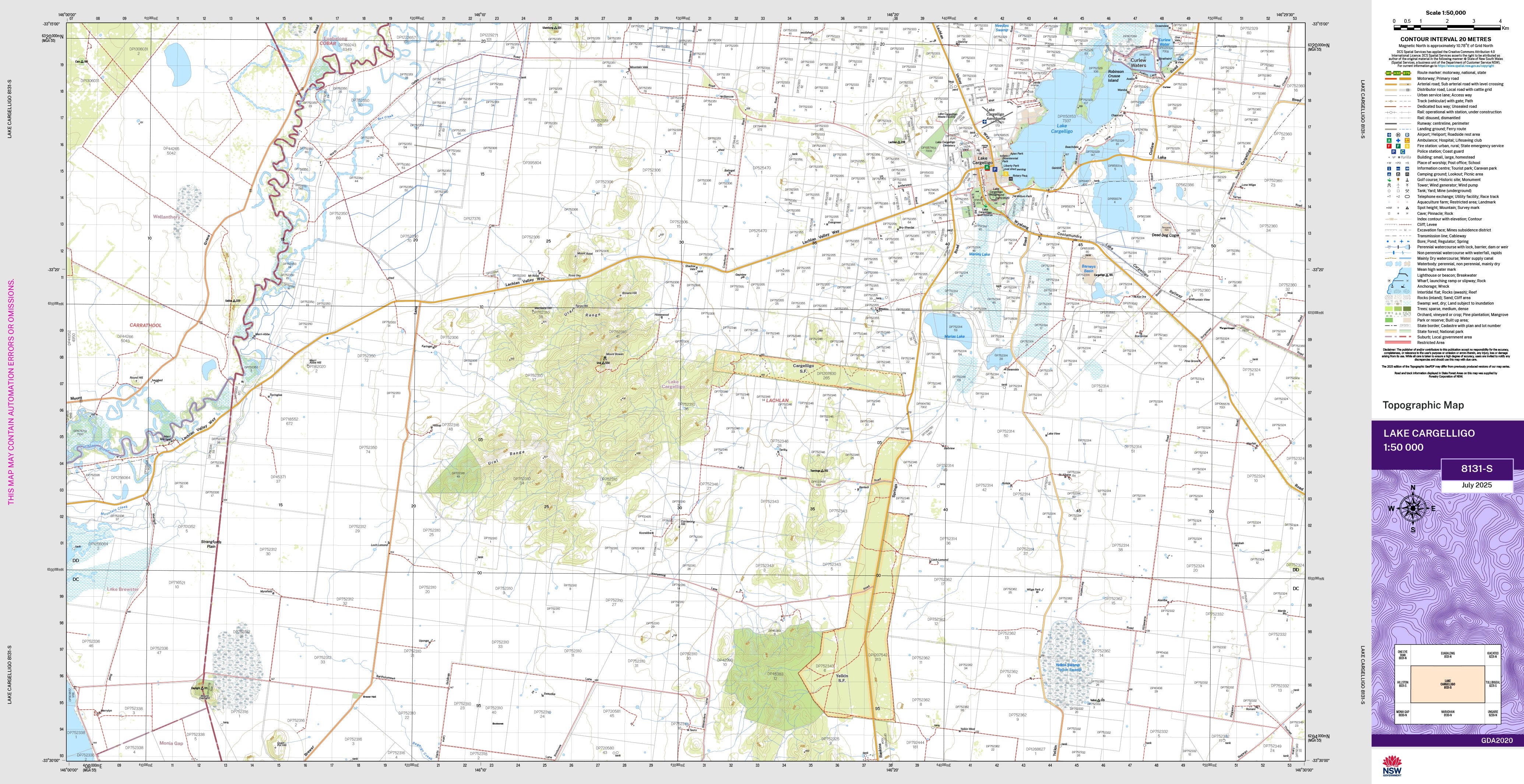 The Lake Cargelligo 1:50,000 scale New South Wales topographic map shows contours, streams, roads, tracks, buildings, place names, points of interest, vegetation, selected administrative boundaries and much more.