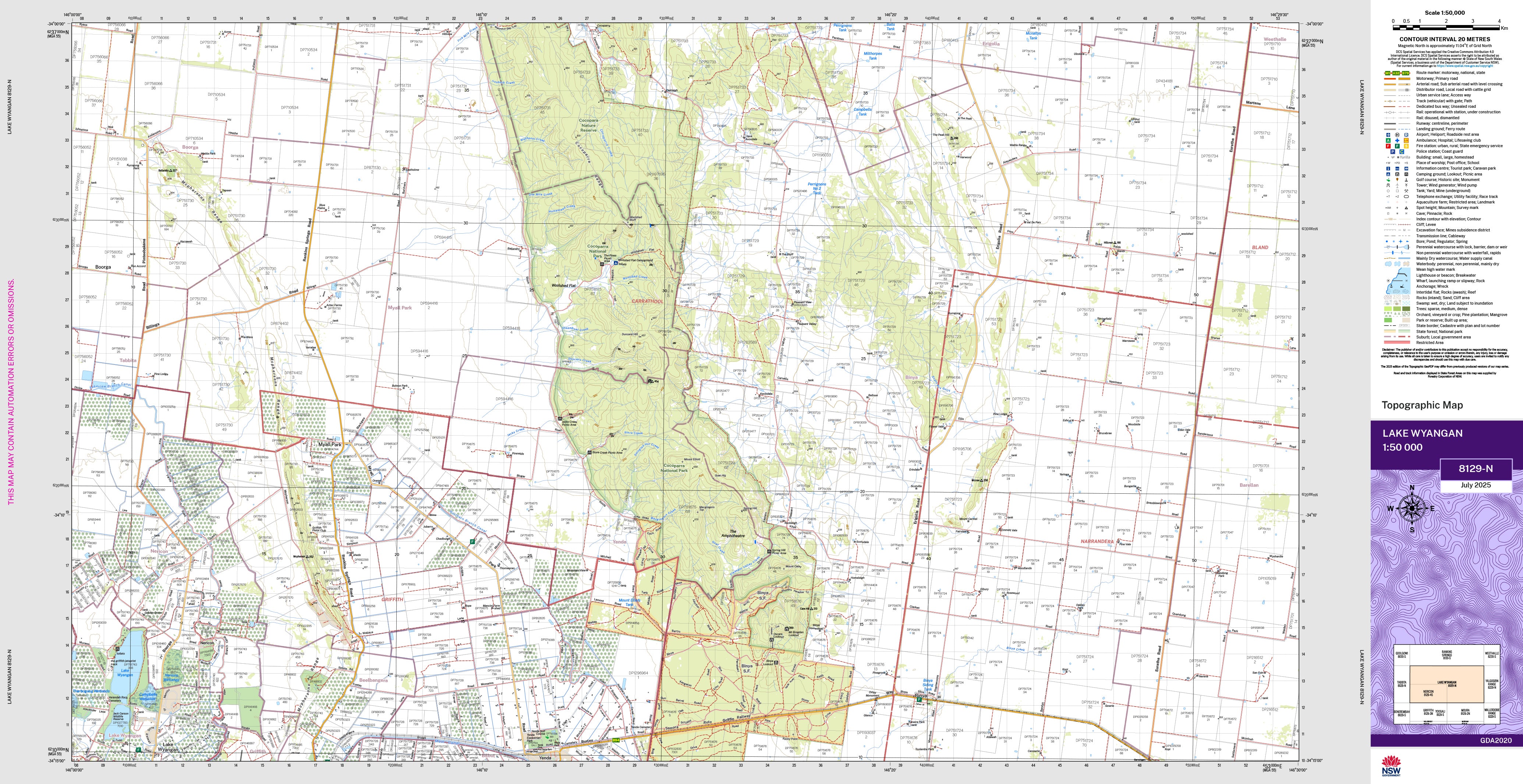 The Lake Wyangan 1:50,000 scale New South Wales topographic map shows contours, streams, roads, tracks, buildings, place names, points of interest, vegetation, selected administrative boundaries and much more.