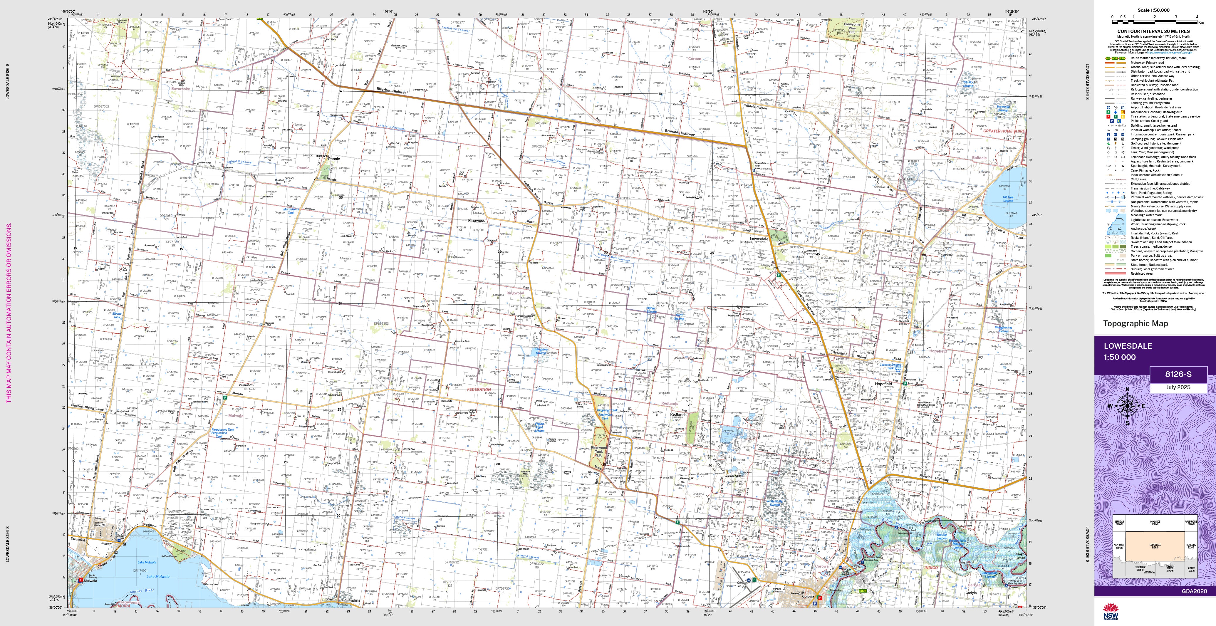 The Lowesdale 1:50,000 scale New South Wales topographic map shows contours, streams, roads, tracks, buildings, place names, points of interest, vegetation, selected administrative boundaries and much more.