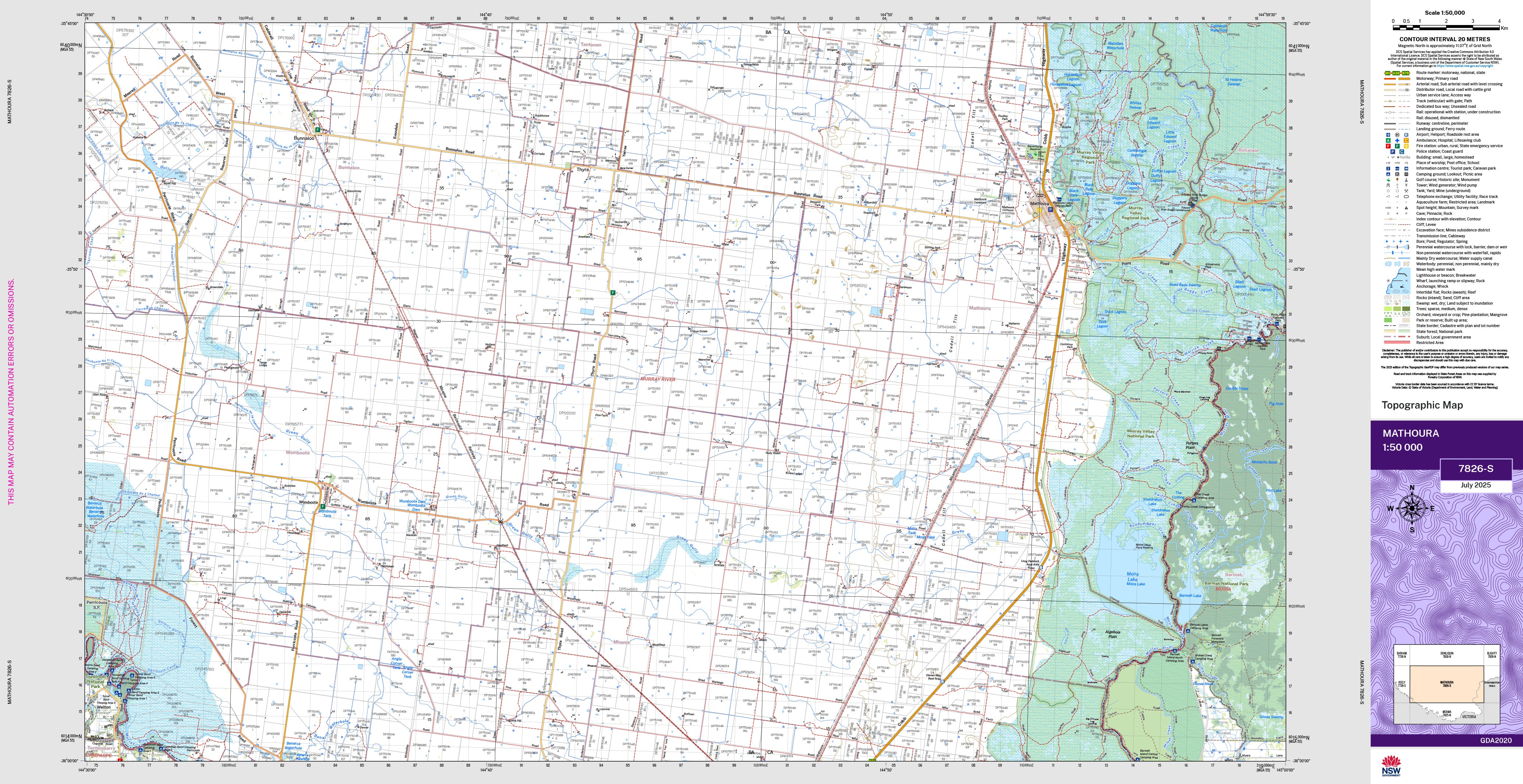 The Mathoura 1:50,000 scale New South Wales topographic map shows contours, streams, roads, tracks, buildings, place names, points of interest, vegetation, selected administrative boundaries and much more.