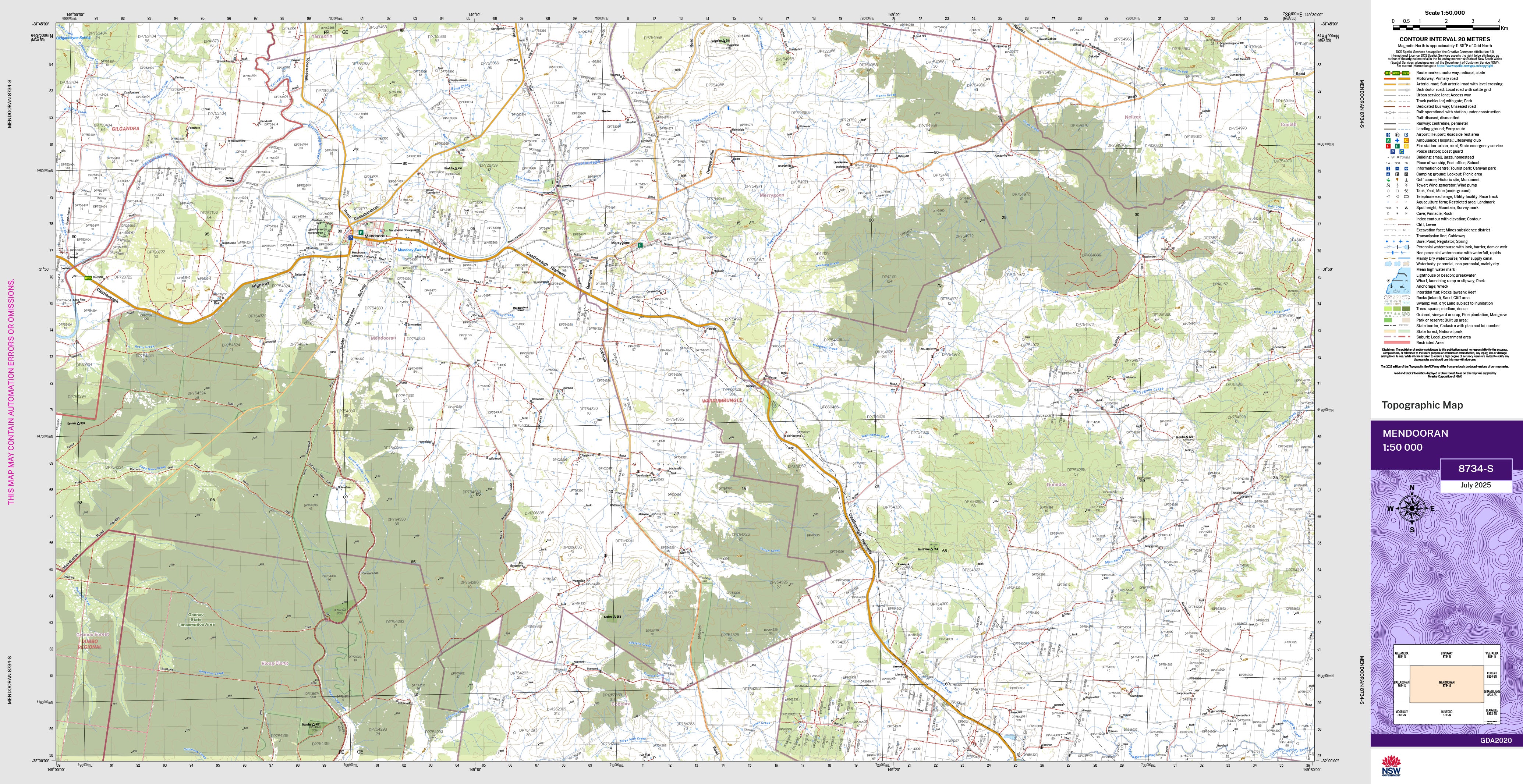 The Mendooran 1:50,000 scale New South Wales topographic map shows contours, streams, roads, tracks, buildings, place names, points of interest, vegetation, selected administrative boundaries and much more.