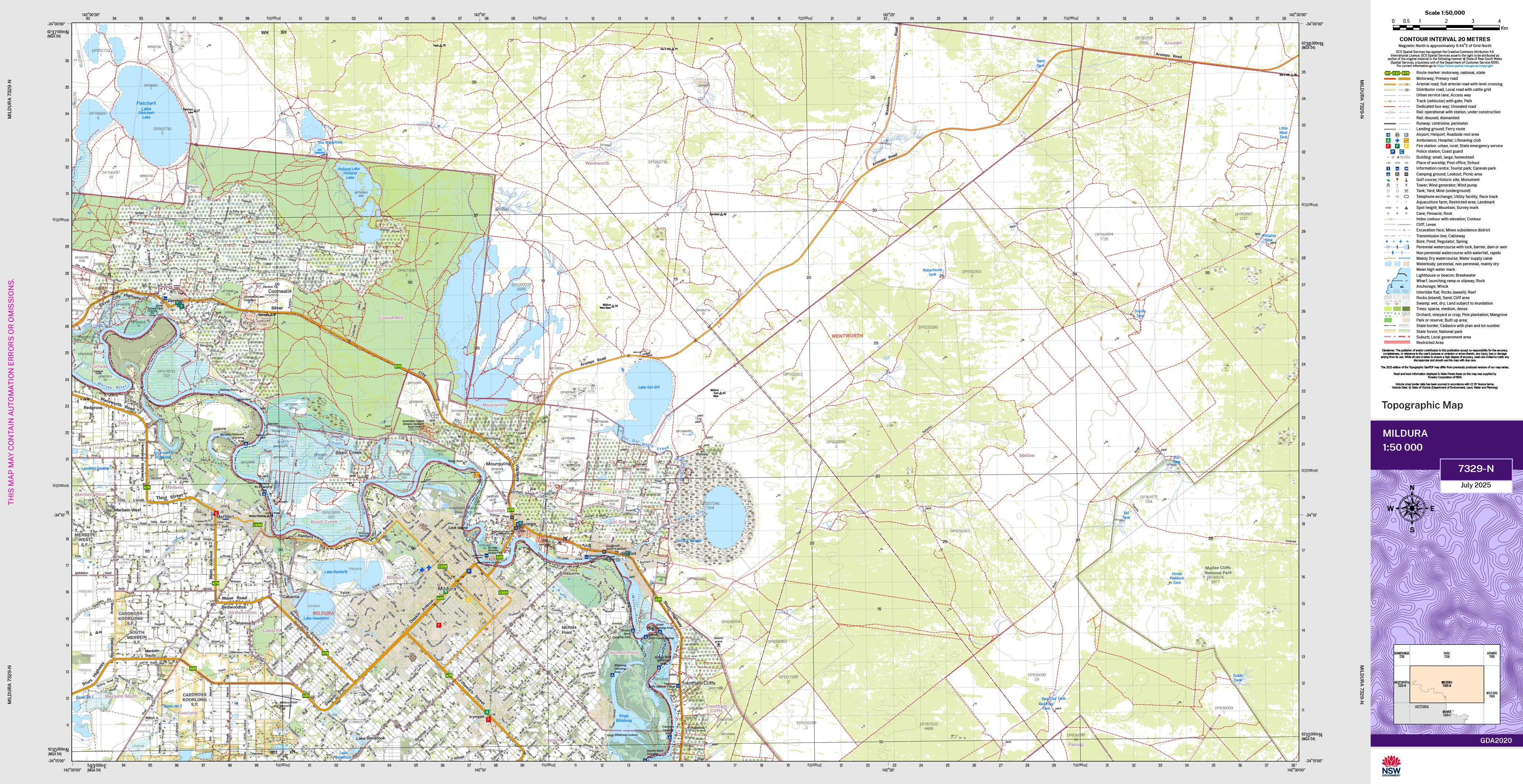 The Mildura 1:50,000 scale New South Wales topographic map shows contours, streams, roads, tracks, buildings, place names, points of interest, vegetation, selected administrative boundaries and much more.